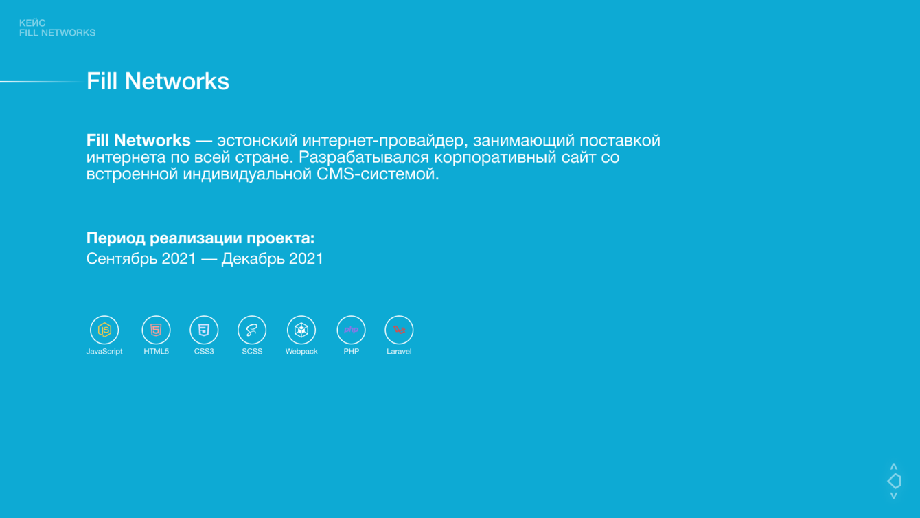 Fill Networks — эстонский интернет-провайдер, занимающий поставкой интернета по всей стране. Разрабатывался корпоративный сайт со встроенной индивидуальной CMS-системой.
