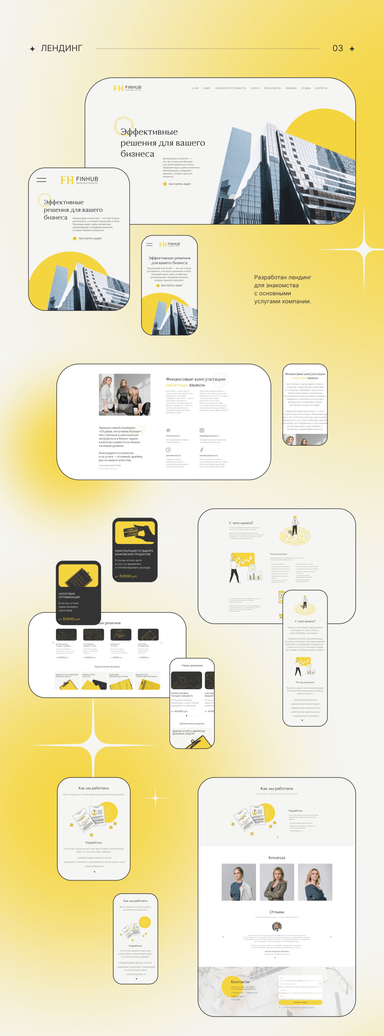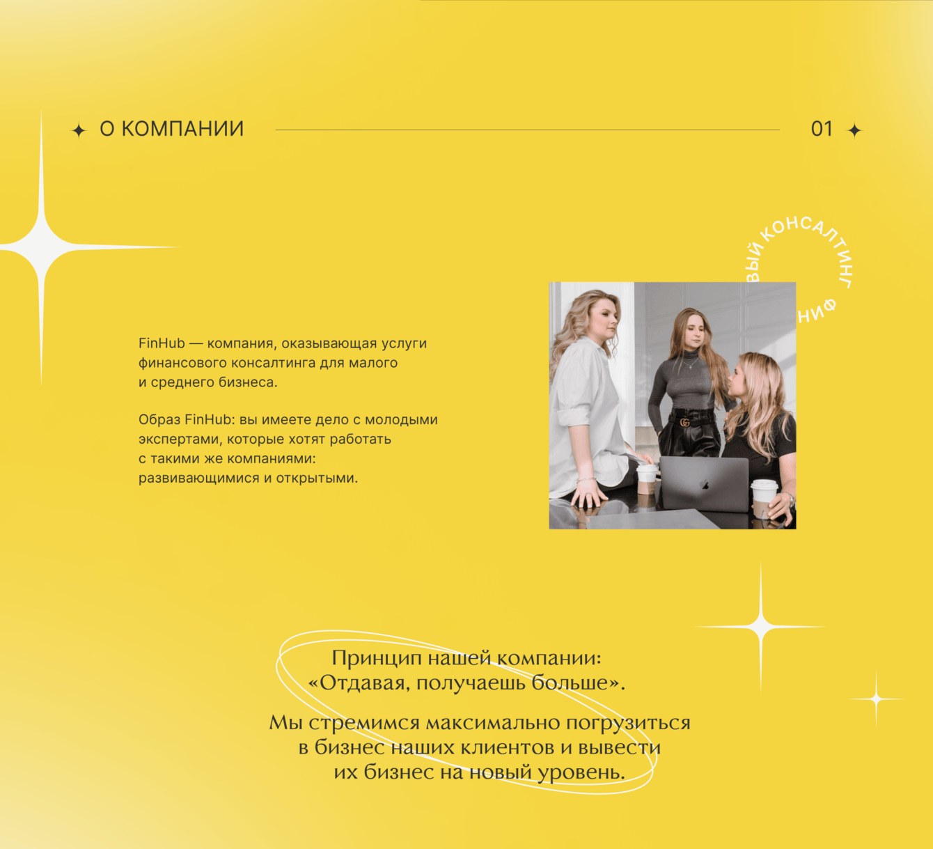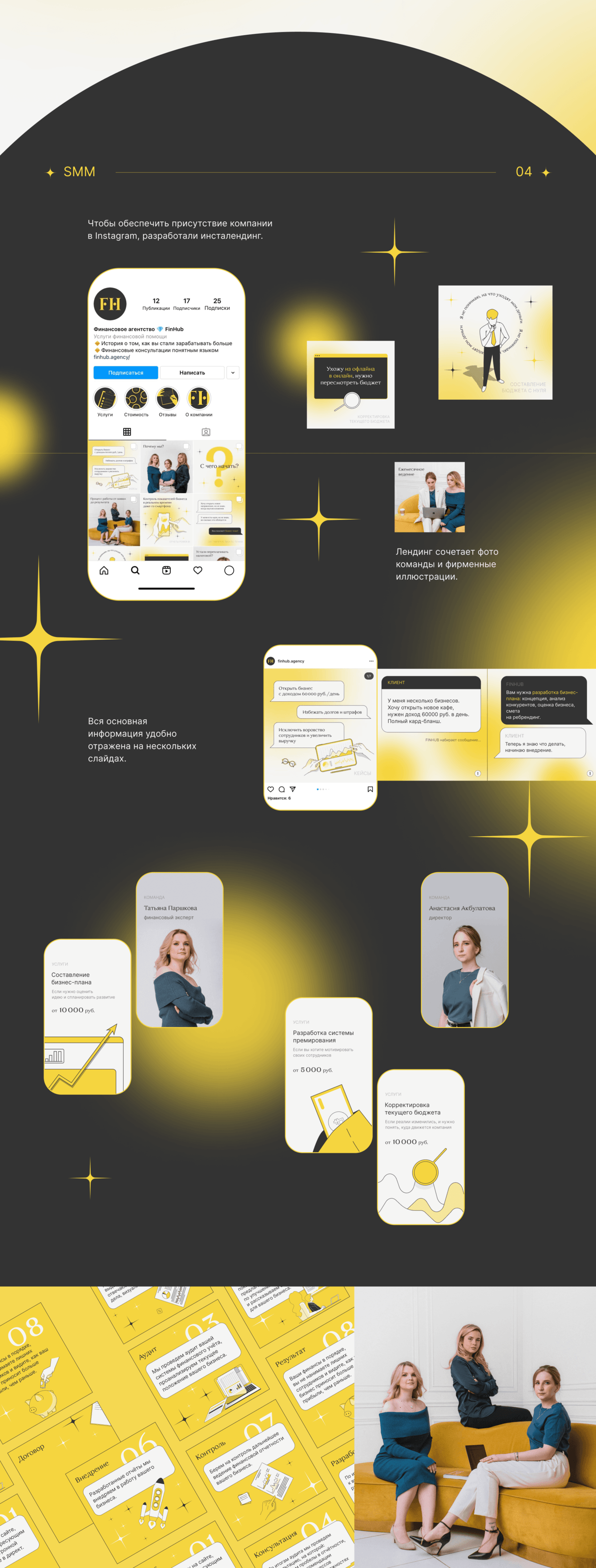 Дизайн разработан в соответствии с брифом. Учитывает принципы компании: аналитика, индивидуальность, грамотность. Цветовая гамма — ахроматики в сочетании с желтым, придающие бренду яркости. Чтобы обеспечить присутствие компании в Instagram, разработали инсталендинг. Лендинг сочетает фото команды и фирменные иллюстрации. Вся основная информация удобно отражена на нескольких слайдах.