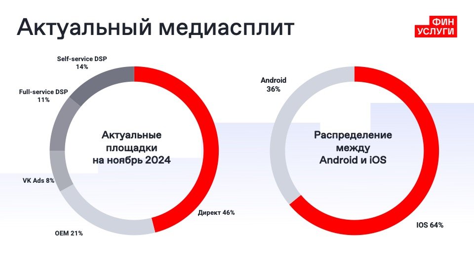 Директ по итогам ноября занимает около половины медиасплита (46%) и обеспечивает основные объемы благодаря стабильной работе, в том числе с iOS, и чистому трафику. OEM находится на втором месте (20%), так как эффективно работает с Android. Для iOS также используем VK Ads, DSP и другие решения, так как Apple Search Ads недоступна в России.