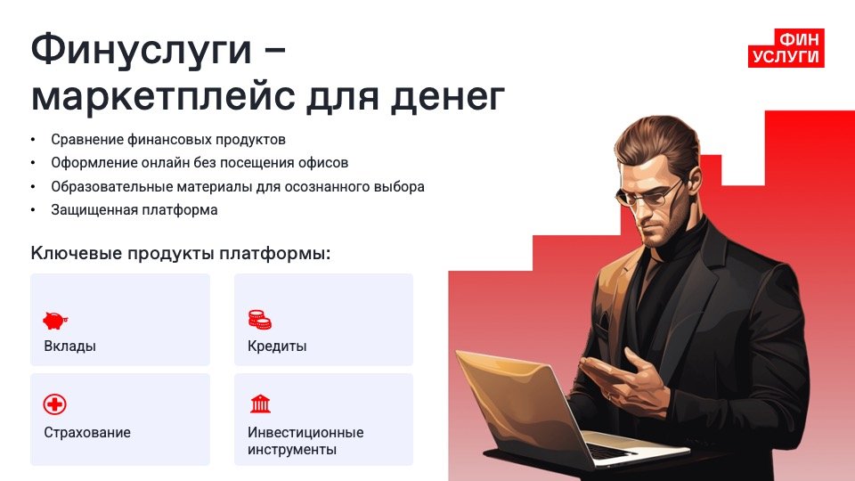 «Финуслуги» — это популярный маркетплейс для сравнения финансовых продуктов от разных поставщиков. На платформе есть услуга оформления онлайн без посещения офисов компаний. Ключевые продукты — банковские вклады, кредиты, страхование и инвестиционные инструменты.