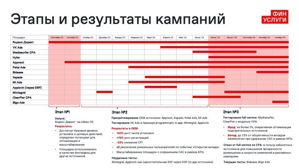 В целом, стратегию строим вокруг надежных каналов, таких как Директ, VK Ads, OEM и DSP, избегая излишних рисков, по согласованию с клиентом.