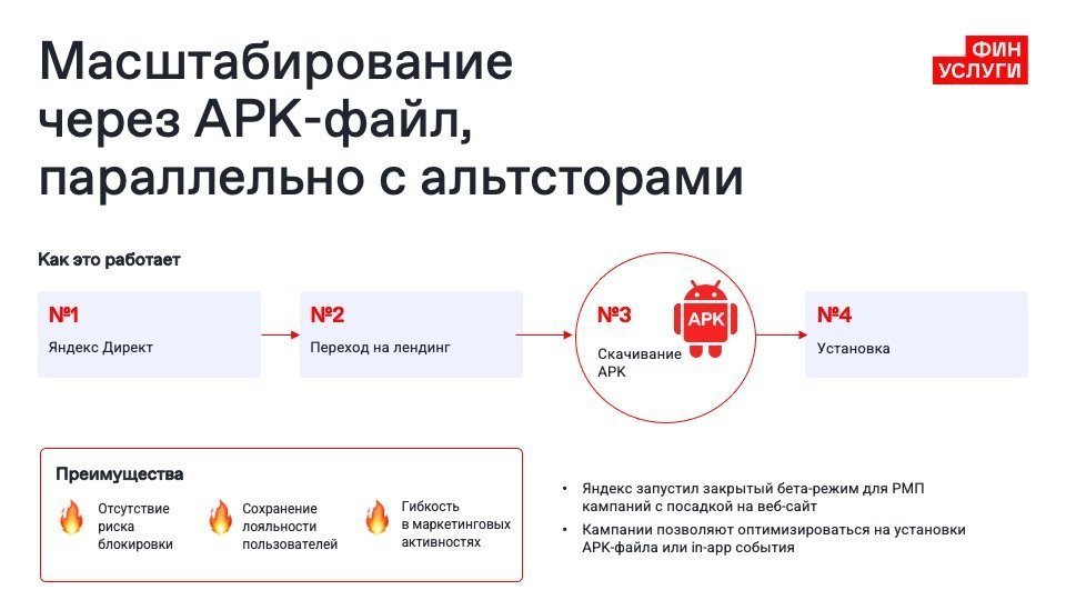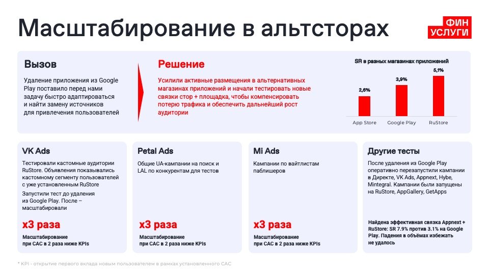 На проекте мы столкнулись с удалением приложения маркетплейса из Google Play, что привело к падению трафика на Android. Чтобы адаптироваться, мы нашли альтернативные решения. Тестировали несколько связок новых магазинов приложений и площадок, чтобы компенсировать потерю трафика и обеспечить дальнейший рост аудитории. Стартовых объемов восстановить не получилось, однако мы нашли несколько удачных связок.
