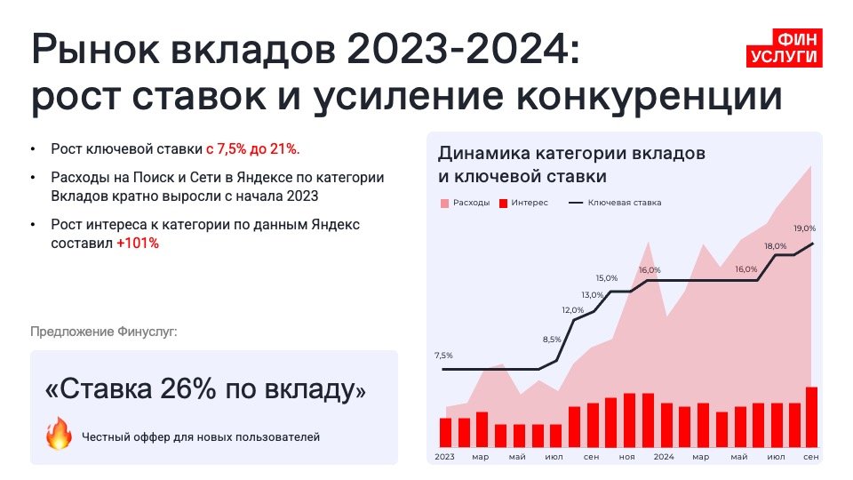 На рынке вкладов в 2023 и 2024 годах произошло усиление конкуренции. Ключевая ставка Центробанка выросла с 7,5% до 21%. Рост интереса к категории, по данным Яндекса, составил 110%. Расходы на рекламу в категории «Вклады» выросли кратно на Поиске и Сети Яндекса. Маркетплейс «Финуслуги» предложил честный оффер для новых пользователей: «Ставка 26% по вкладу».