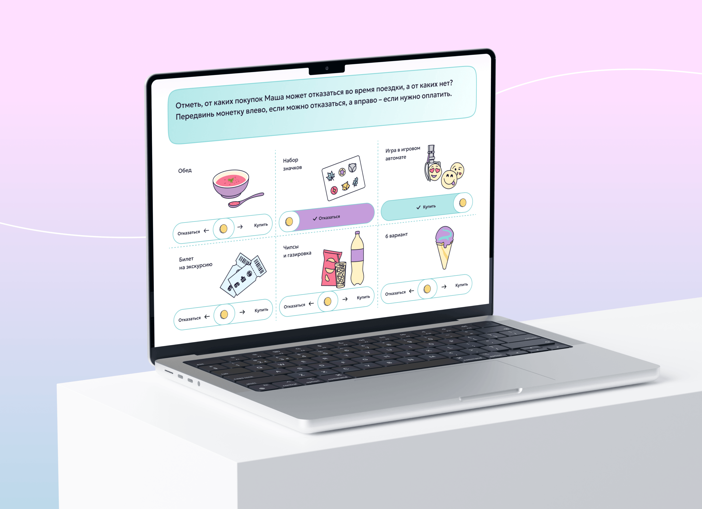 Появились три типа интерактивных заданий: выбор нужных покупок, оценка финансового решения, выбор ответа через раскрашивание.