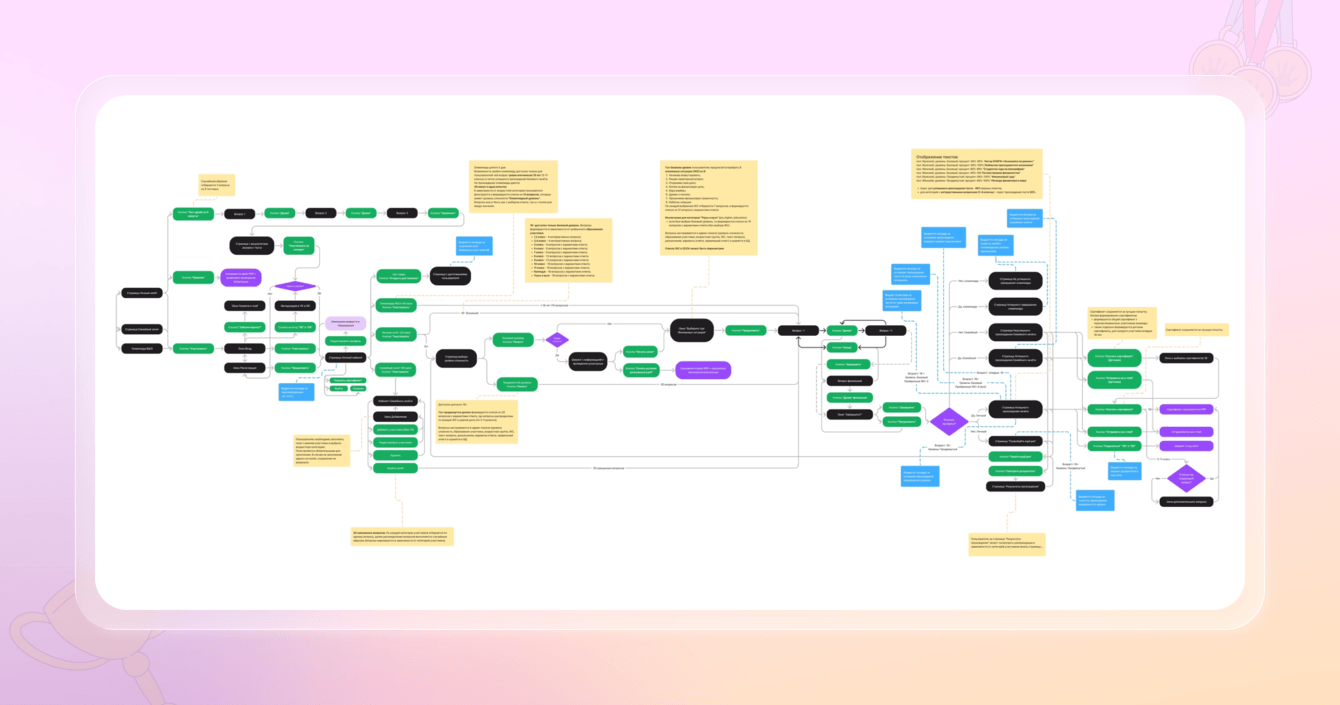Чтобы управлять этой системой и развивать ее дальше, мы собрали карту пользовательского пути. Она показывает все этапы взаимодействия пользователя с платформой: от первого захода на сайт до получения сертификата или достижения.