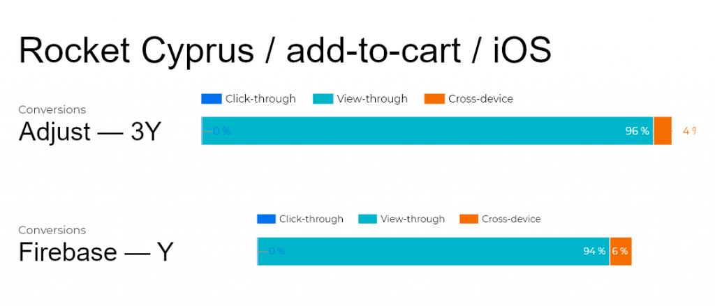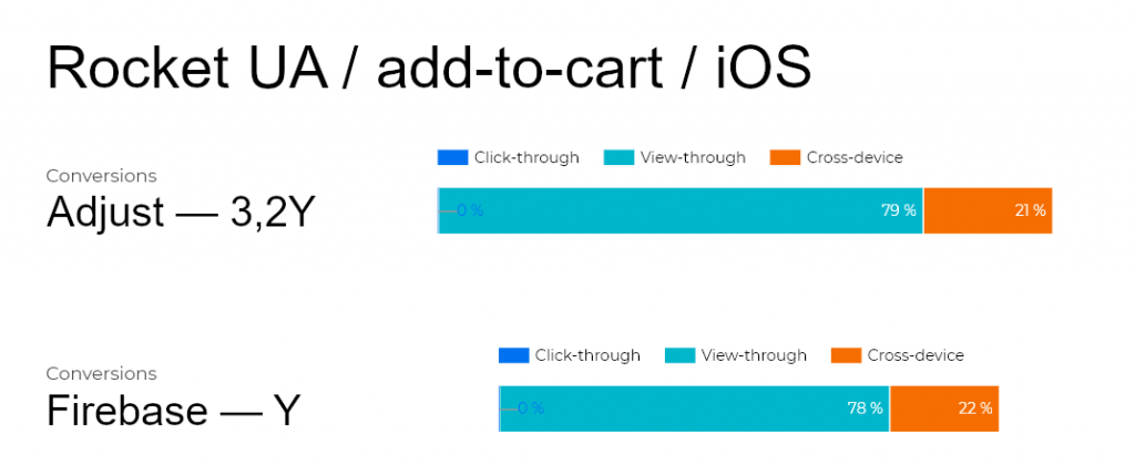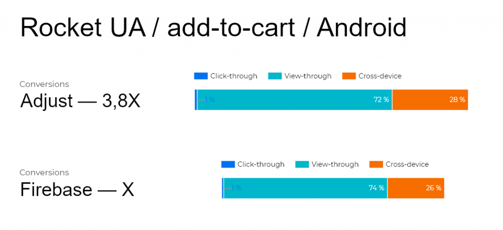 Но в абсолютных значениях Firebase показывает лишь треть конверсий iOS, которые отображаются в Adjust. А для Android-приложений разница могла быть и в четыре раза.