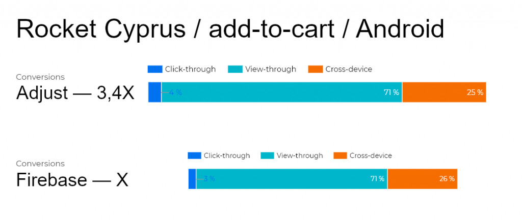 В конце флайтов мы сравнили данные о конверсиях, которые смогли затрекать Firebase и Adjust. Обе системы справились с подсчетом отложенных post-view и cross-device конверсий; даже их соотношение сохранялось в рамках погрешности.