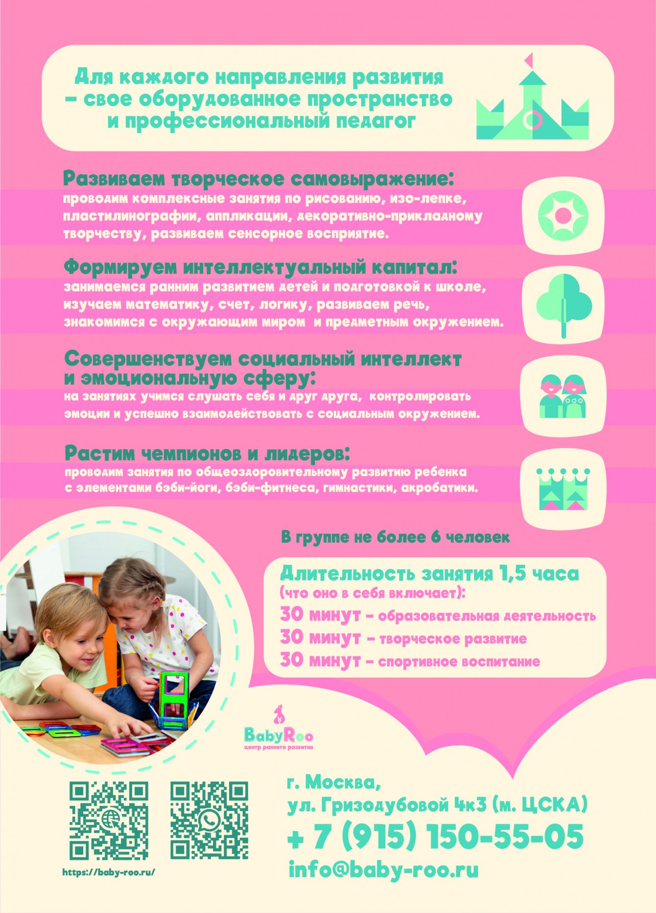 «BabyRoo» - принципиально новый центр раннего развития в Москве. Занятия проводятся для детей от 2 до 7 лет. Центр включает в себя несколько стильных и современных пространств, каждое из которых предназначено только для одного направления деятельности: спортивный зал – для спортивных занятий, комната интеллектуального и эмоционального развития – для общеобразовательных занятий (развитие речи, математика, сказкотерапия и т.д.), творческое пространство – для занятий искусством. Необходимо, чтобы дети больше играли, для этого была создана уникальная игровая для сюжетно-ролевых игр в стиле «французский прованс».