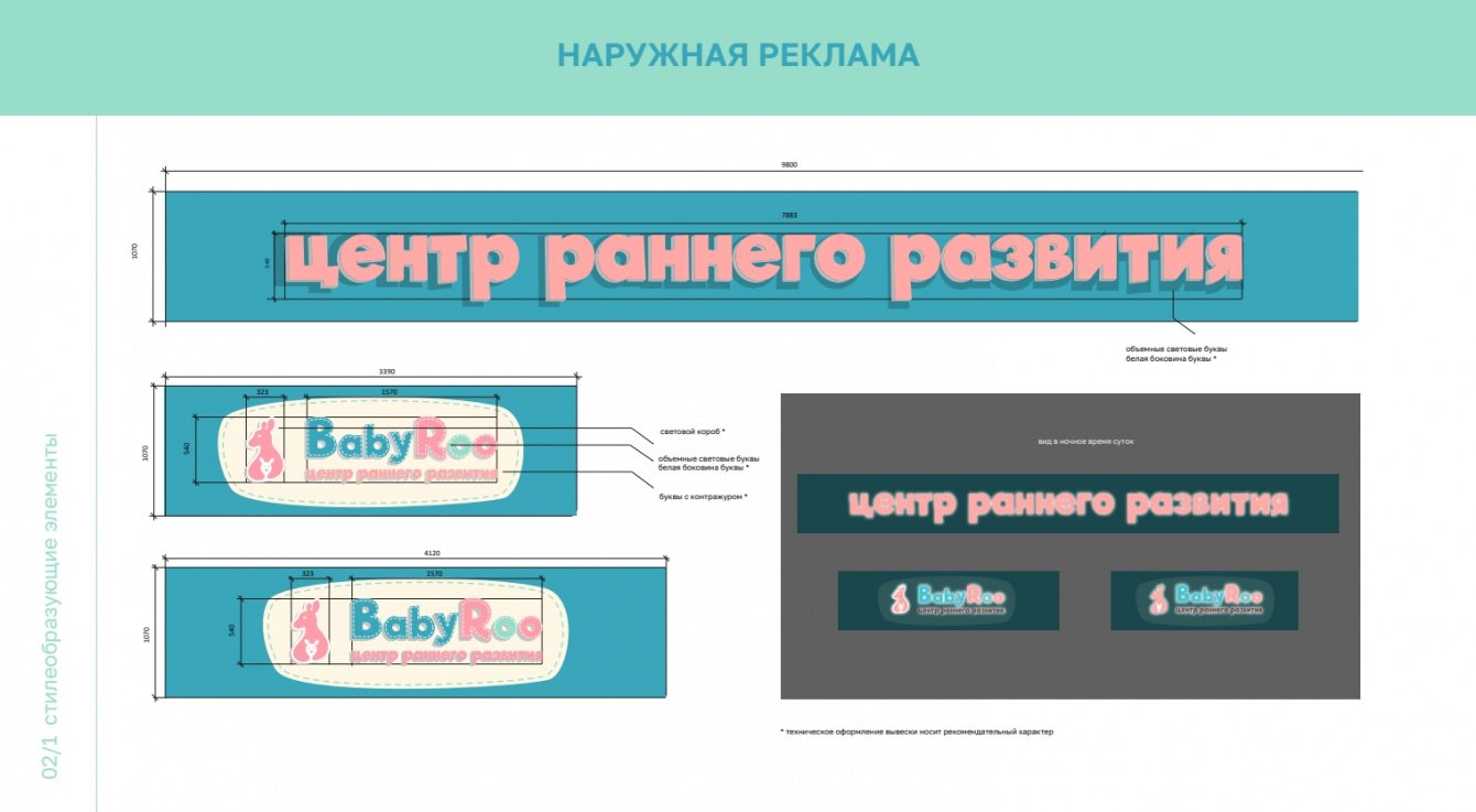 Клиент получил полноценный фирменный стиль. Было представлено от 3 до 5 концепций каждого элемента айдентики и проведен их препресс. Бренд-константы закреплены в гайдлайне и показаны, как они выглядят на различных рекламных носителях. Сайт заказчика, который также разработала наша команда - https://baby-roo.ru/
