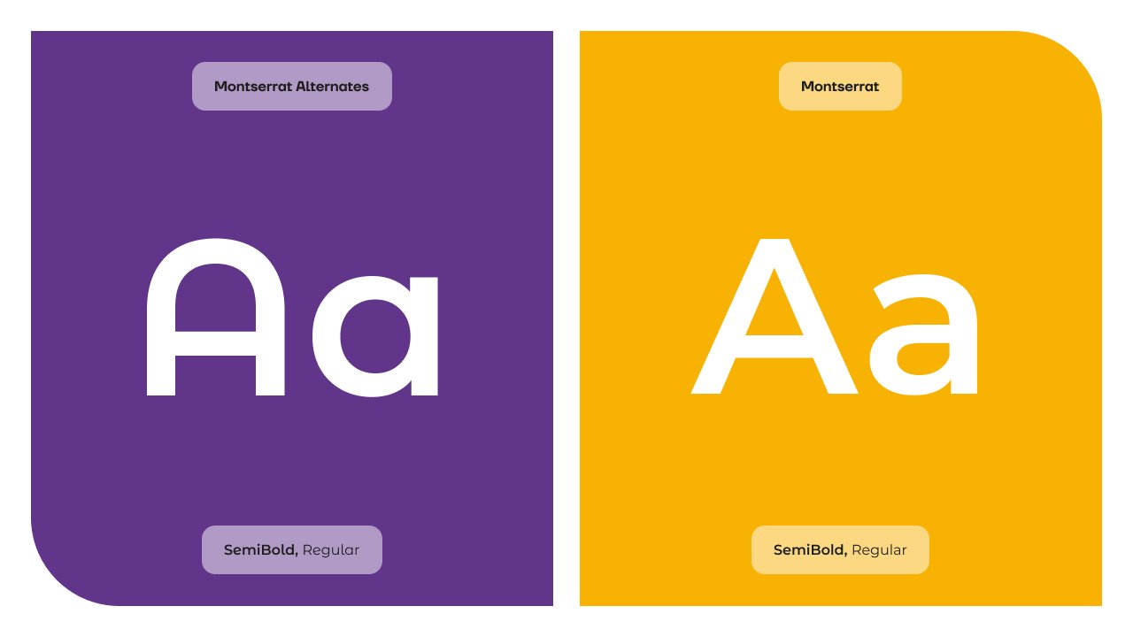 Основные цвета фирменного стиля: фиолетовый и жёлтый.