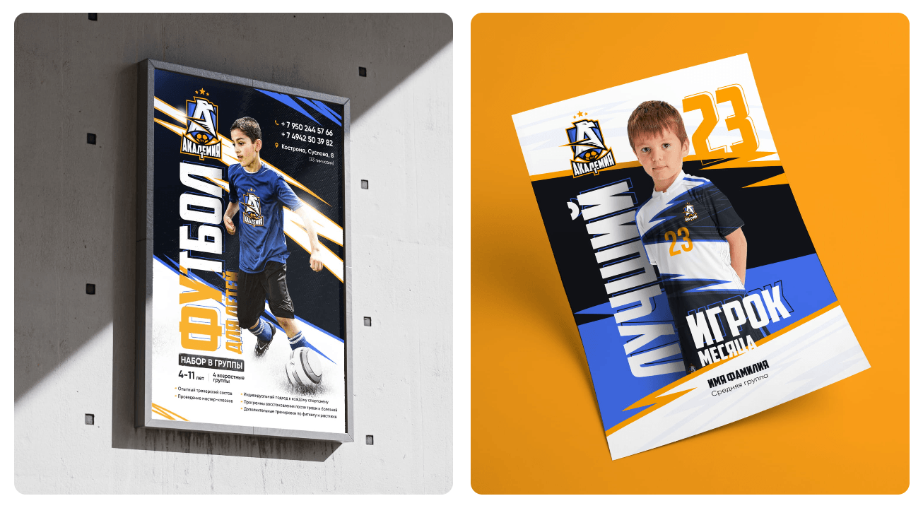 В 2022 году мы создали фирменный стиль для детской футбольной академии, ориентированной на внедрение современных методов обучения и привлечение детей к спорту. Логотип был основан на стилизованной букве «А», напоминающей орла, что символизирует рост, скорость и стремление к успеху. В дизайне использованы элементы герба и футбольного мяча, подчеркивающие спортивную атмосферу. Яркие оранжевые и синие оттенки отражают энергичность и дух соревнования. Стиль был адаптирован для формы, атрибутики и других материалов академии, что способствовало повышению ее узнаваемости.
