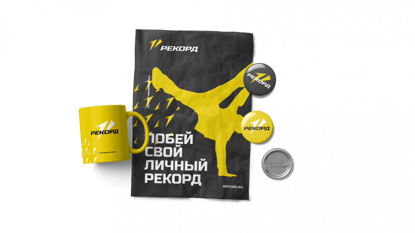 Фирменный стиль помогает создать образ активной и динамичной спортивной школы "Record", подчеркивая ее фокус на достижении выдающихся результатов и побед. Символизирует оптимизм и энергию, что вдохновляет молодых спортсменов на большие достижения.