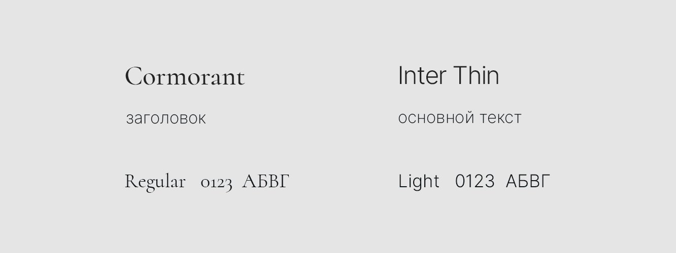 Cormorant (Regular) — этот шрифт используется для заголовков. Он обладает изысканными линиями, что придает текстам стильный и слегка ретро-эффект. Этот шрифт идеально подходит для акцентов в заголовках и визуально подчеркивает важность информации.