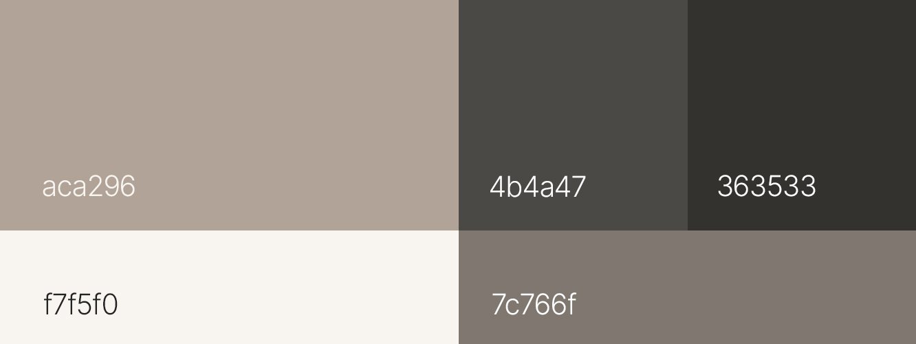Цветовая палитра для бренда была выбрана с акцентом на элегантность, стиль и современность. В палитре использованы мягкие, но выразительные оттенки. Эти цвета гармонично сочетаются, создавая ощущение утонченности и стиля, что идеально соответствует духу студии дизайна интерьеров.