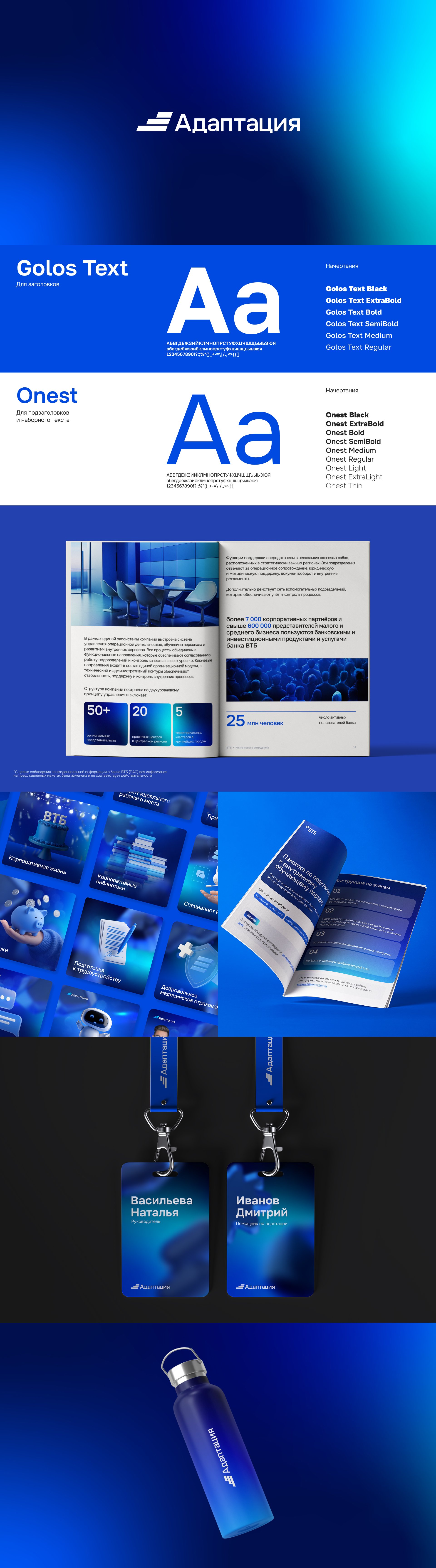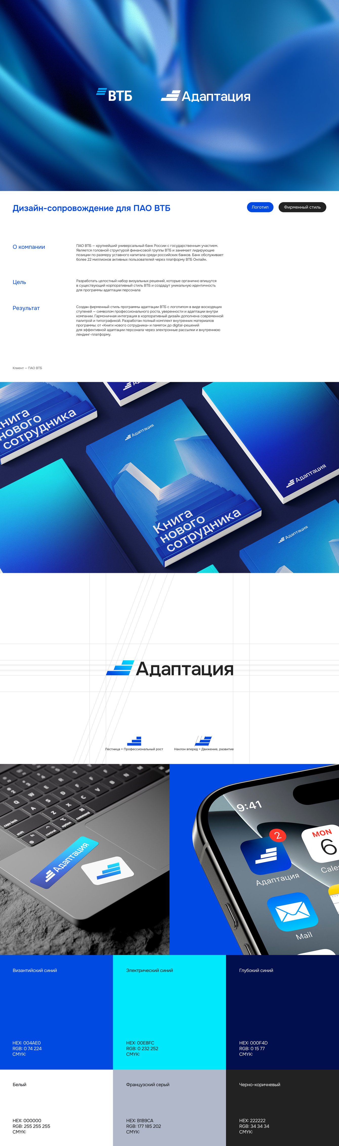 Для программы адаптации персонала мы разработали целостную визуальную систему, органично встроенную в корпоративную айдентику банка. В основе - логотип с восходящими ступенями, символизирующий рост, уверенность и профессиональный путь сотрудника внутри компании.