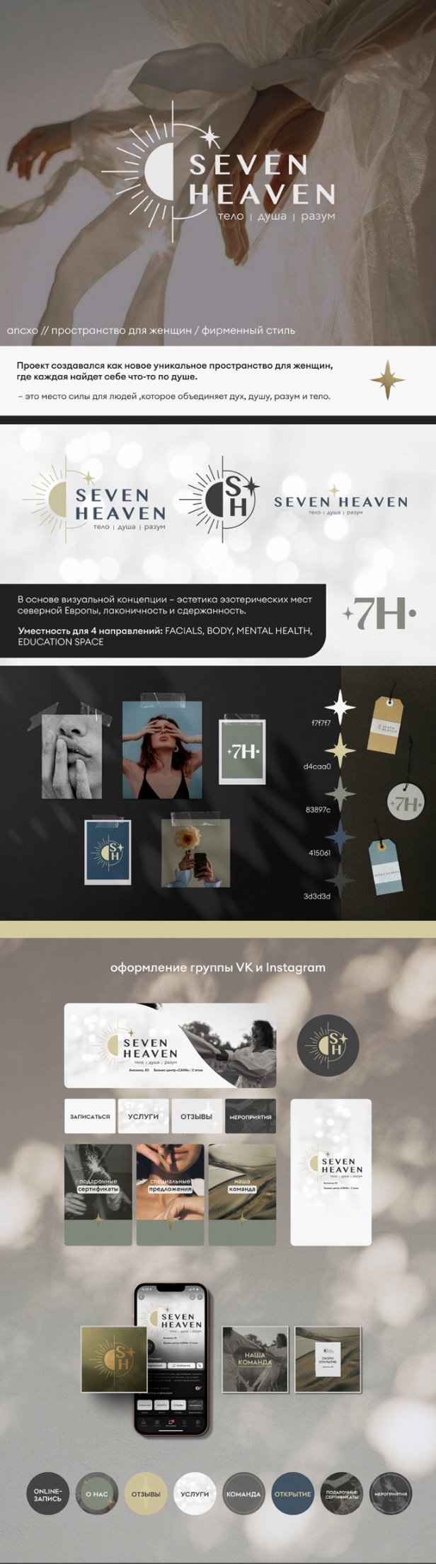 К нам обратилась предприниматель, которая собиралась открывать свое женское пространство с космологическими процедурами, практиками и девичниками. Название было уже выбрано - Seven Heaven. Нашему агентству было необходимо отразить позиционирование будущего пространства в фирменном стиле.
