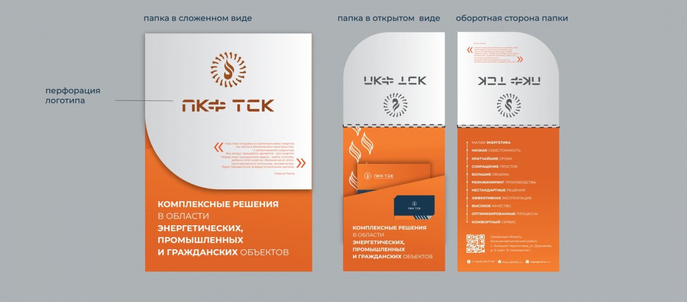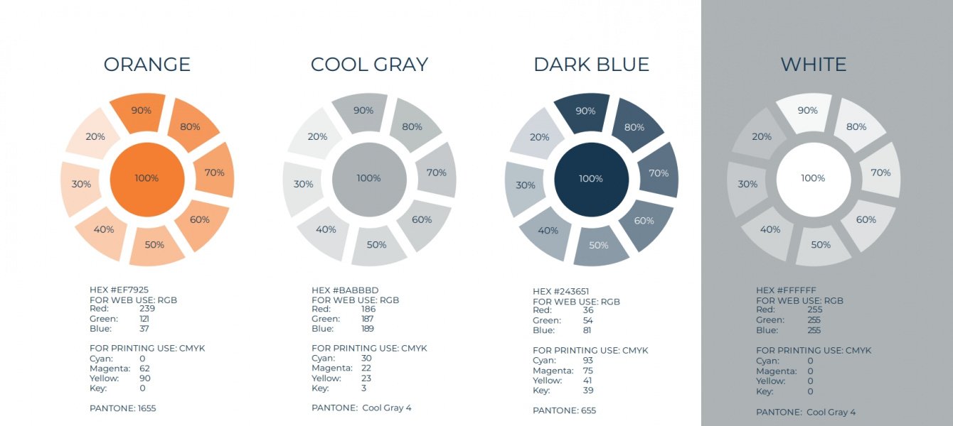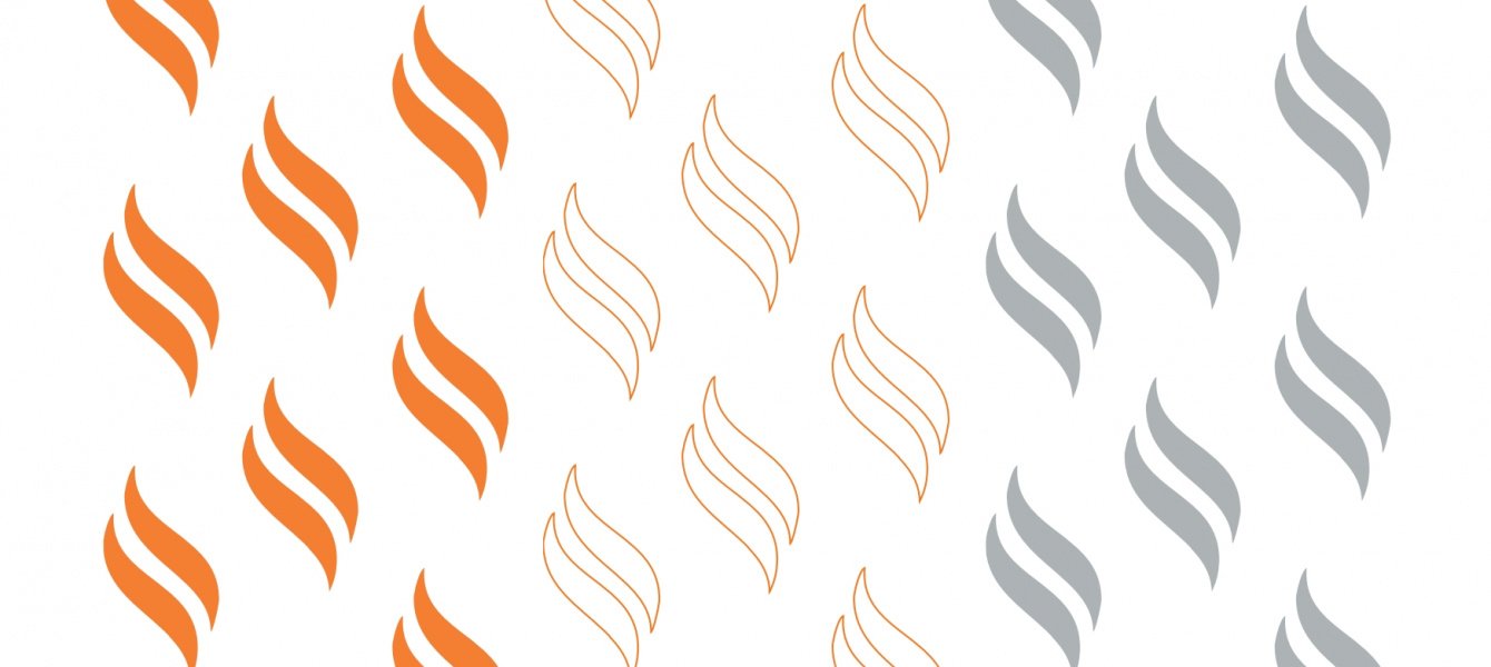 Фирменная палитра состоит из трех цветов: оранжевого, светло-серого и темно-синего. Паттерн образован из логотипа, выделяя «языки пламени».