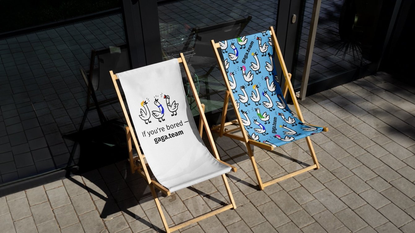 Над фирменным стилем для gaga.team работать было приятно, потому что у клиента был очень четкий запрос. Мы сразу обговорили, что в логотипе должен быть слышен звук. Мы использовали минималистичную графику, строили ее именно на персонажах, добавив им разные детали, чтобы показать, что приложением пользуются и девушки, и юноши, и ребята серьезных профессий, и неформалы. В этом проекте мы много внимания уделили анимации: она помогает усилить эффект общения, гоготания. У нас гуси ходят друг за другом, гогочат, машут крыльями. Из толпы гусей сложился классный паттерн, который изначально и не задумывался. Просто посмотрели и поняли, что смотрится классно.