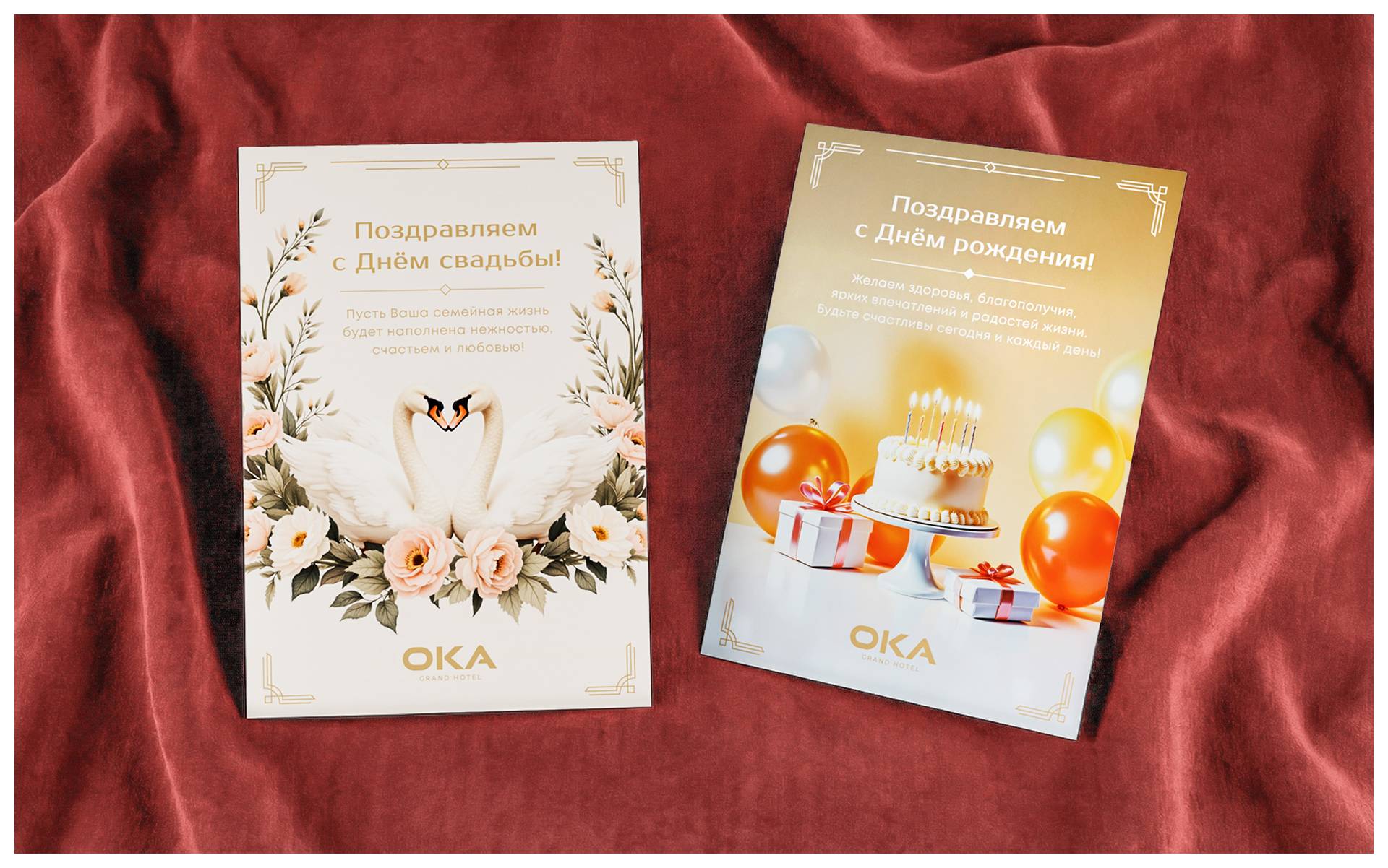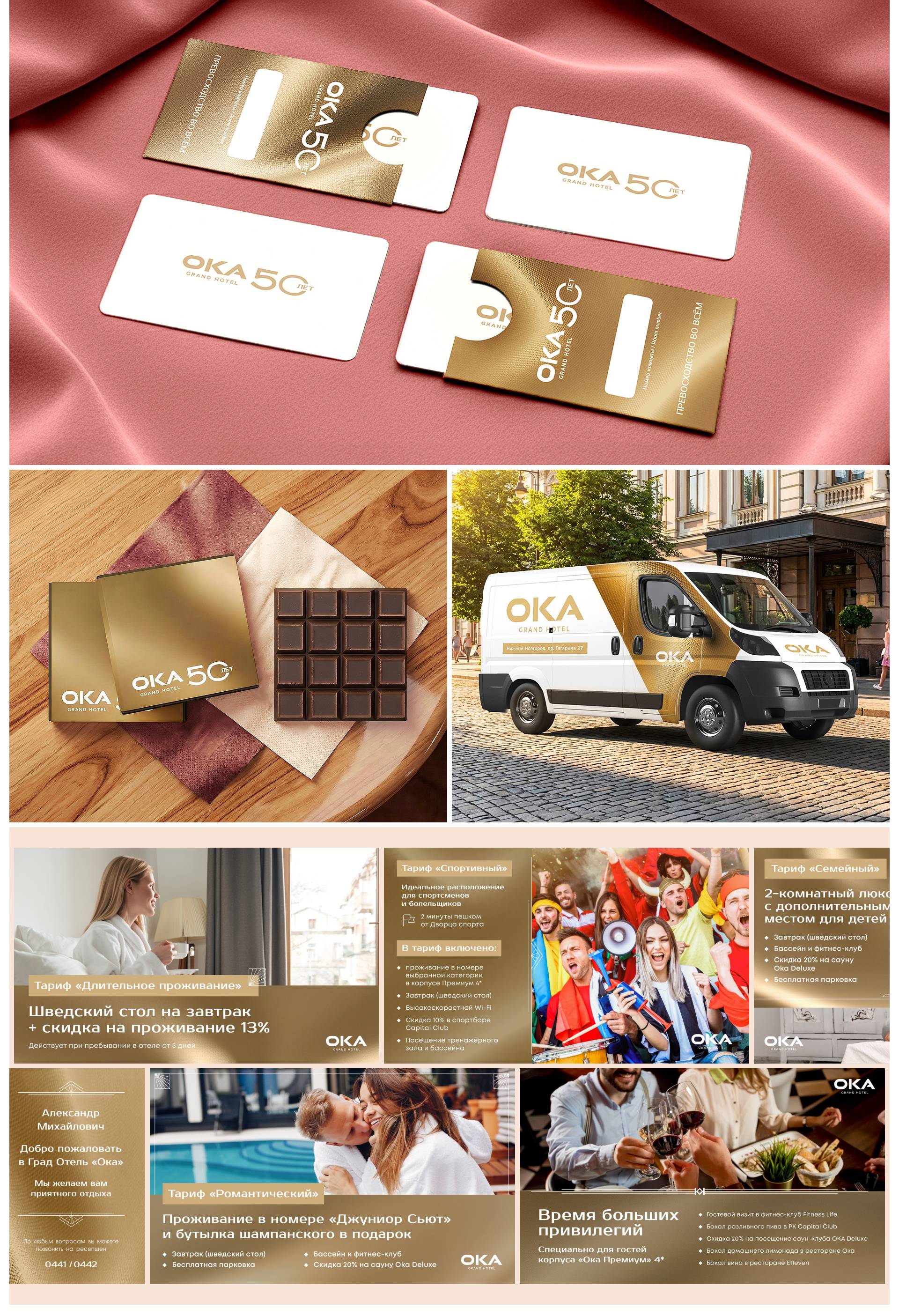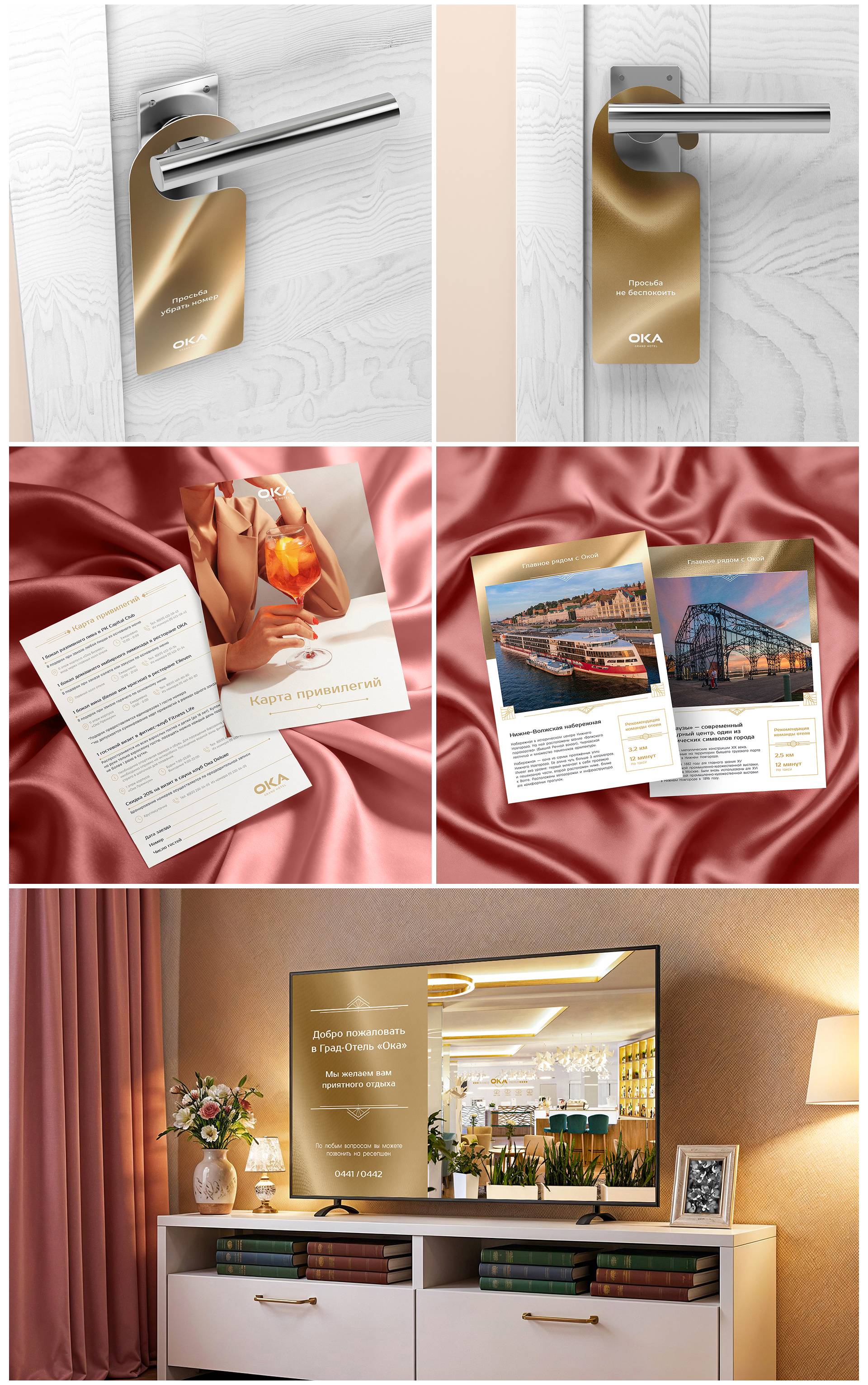 В результате «Гранд Отель Ока» получил глубоко проработанную визуальную систему, которая подчеркивает высокий статус отеля, создавая ощущение комфорта и роскоши в каждой точке касания с гостем.