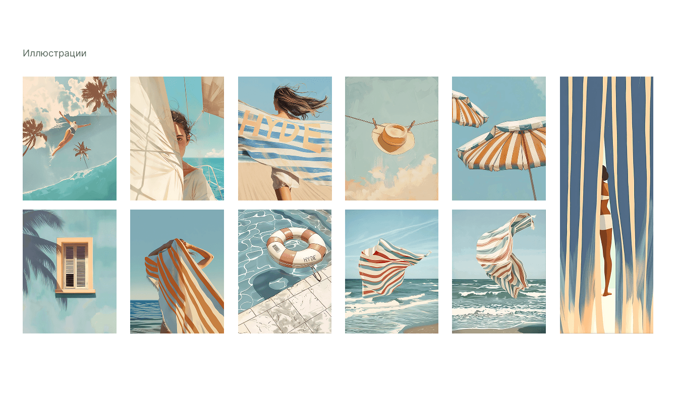 5) Создание иллюстраций – ассоциации на волны, берег, легкий ветер. Главная героиня, которая живет эту прекрасную жизнь. Мы использовали искусственный интеллект, но с четкими промптами и итерациями, чтобы добиться нужной глубины и настроения.