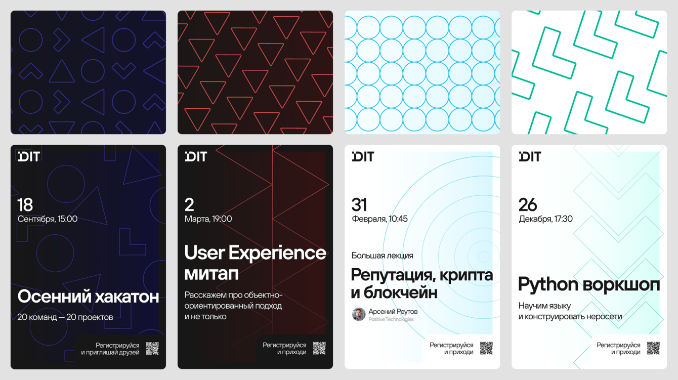 Параллельно решали задачу с формами и составляли минимудборды с крутыми приёмами. Чтобы максимально эффективно решить задачу масштабируемости, выбрали простые геометрические фигуры: треугольник, круг, скобка. Их сопоставили с основными направлениями. Цвета соответствуют брендбуку университета.