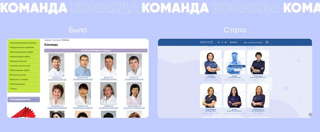 Одна из ключевых страниц стоматологии - специалисты, которые там работают. Важно представить их грамотно и дать исчерпывающую информацию об их специализации, опыте работы и документах.