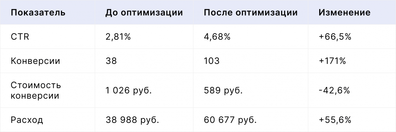 Эти результаты наглядно демонстрируют эффективность нашего подхода: при увеличении расходов на 55,6% мы смогли увеличить количество конверсий на 171%, одновременно снизив стоимость каждой конверсии на 42,6%.