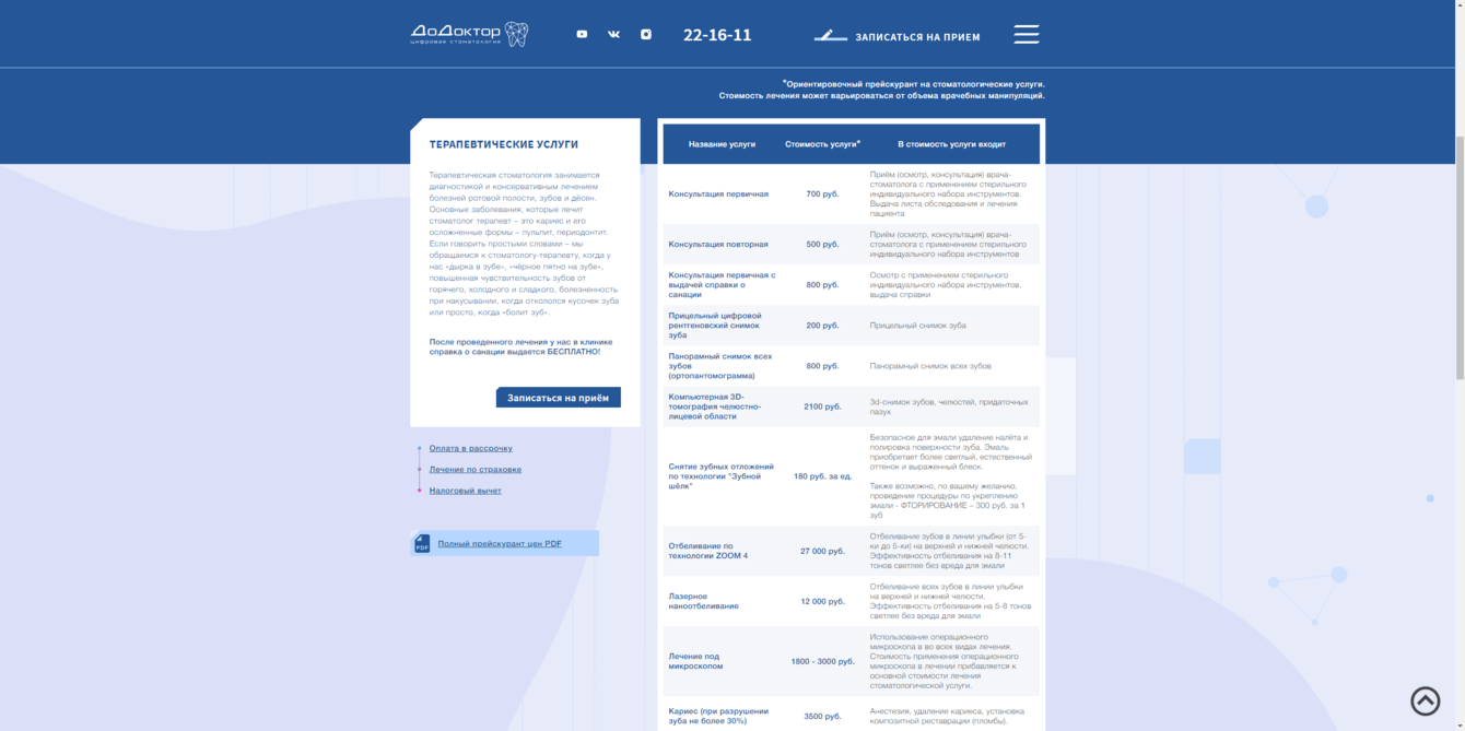В новой версии мы разделили описание и прейскурант, а строки в таблице выделили через строку. Кроме того, добавили возможность скачать прейскурант в формате PDF.