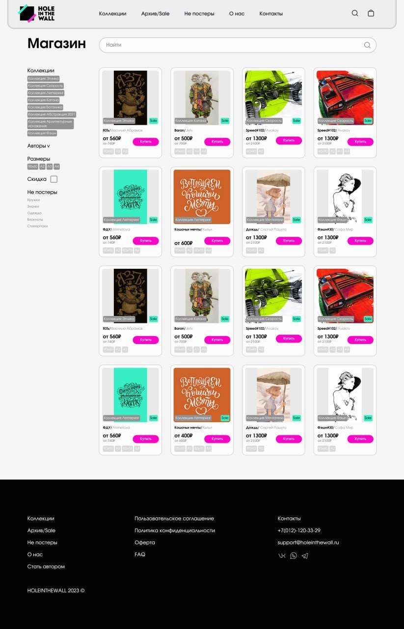 Hole in The Wall — стартап по продаже авторских постеров. Нашей задачей было создать бренд с нуля, от имени и логотипа, до проработки фирменного стиля на всех носителях, главным и самым масштабным из которых стал сайт.