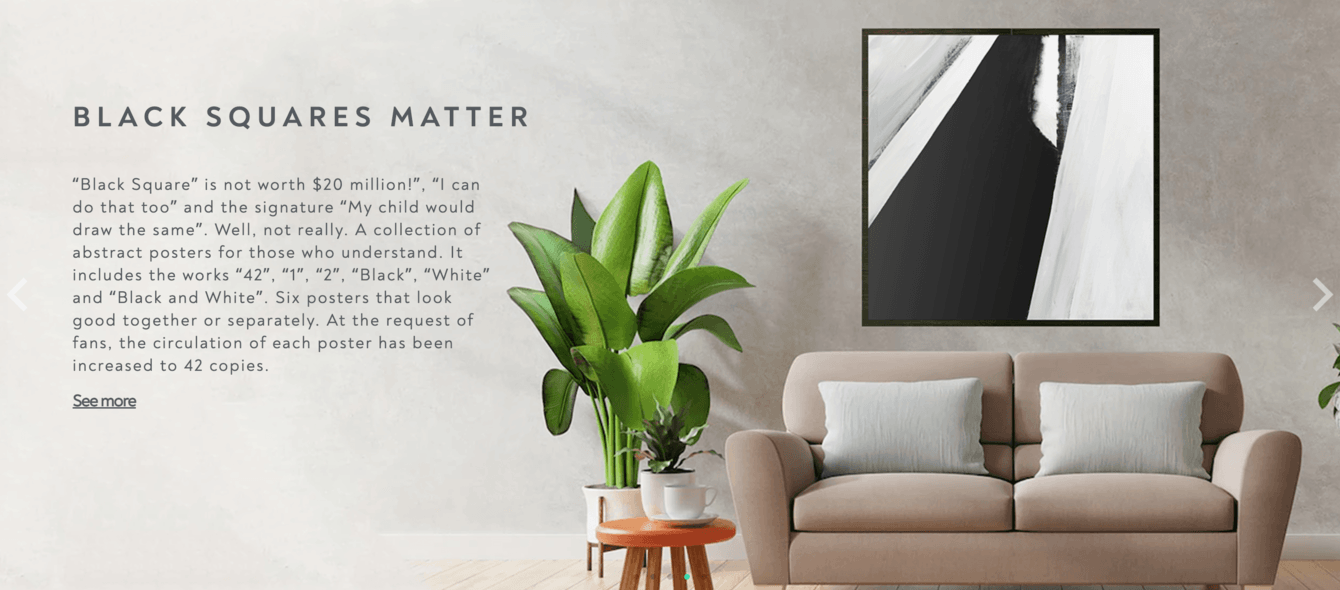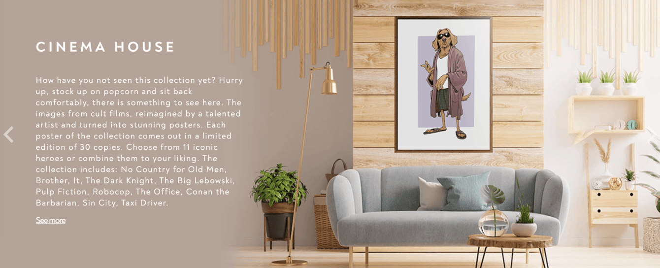 Для страниц с коллекциями мы остановились на минималистичном дизайне, который не отвлекает внимание посетителя от постеров.