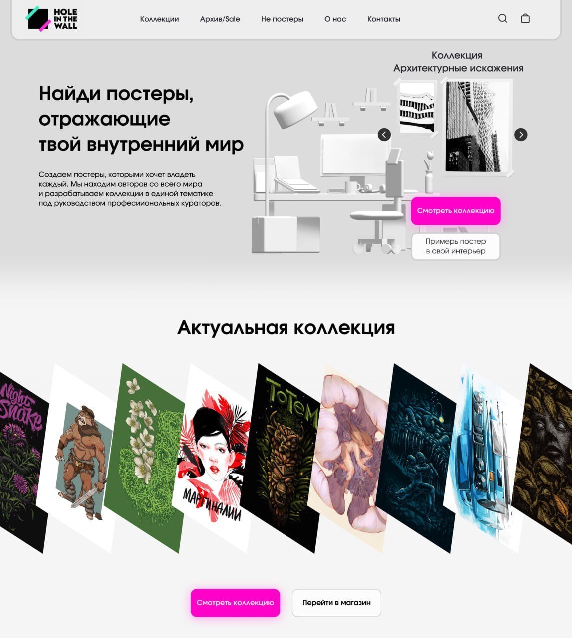 Постеры Hole in The Wall создаются талантливыми художниками, а позже группируются в уникальные коллекции профессиональными кураторами, поэтому центральным элементом главной страницы стала карусель, облегчающая навигацию по коллекциям.