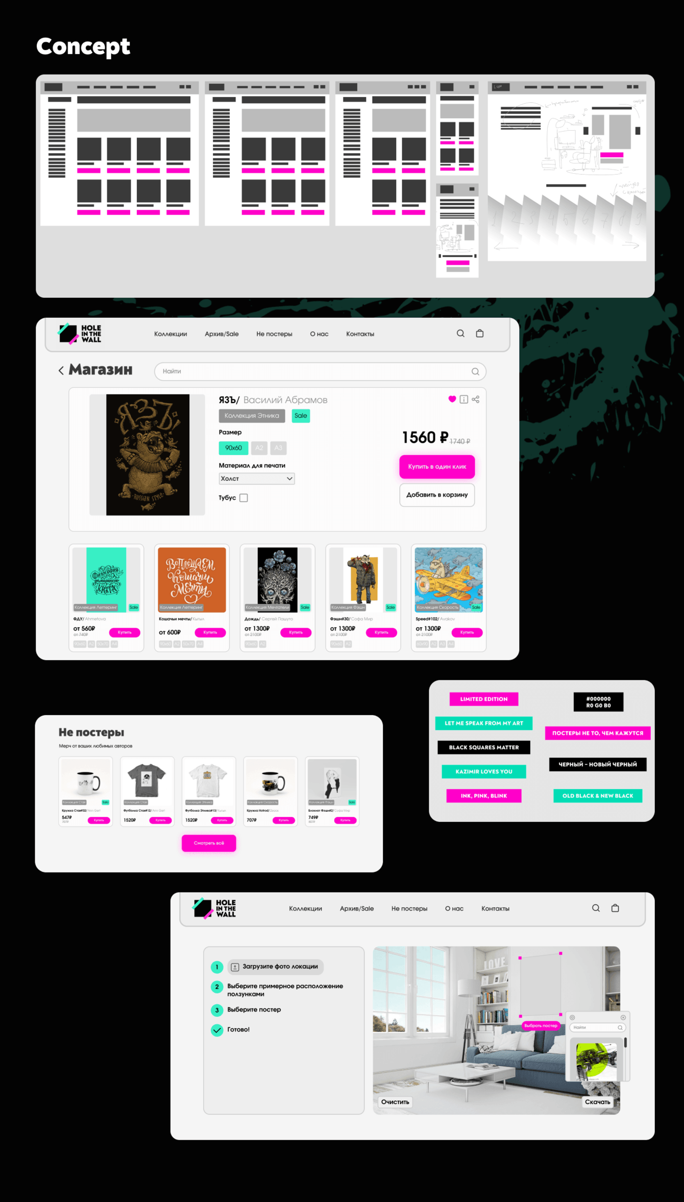 Hole in The Wall — стартап по продаже авторских постеров. Нашей задачей было создать бренд с нуля, от имени и логотипа, до проработки фирменного стиля на всех носителях, главным и самым масштабным из которых стал сайт.