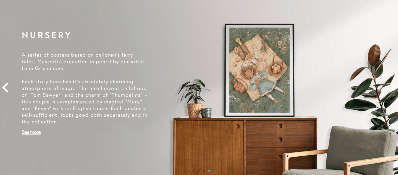 Для страниц с коллекциями мы остановились на минималистичном дизайне, который не отвлекает внимание посетителя от постеров.