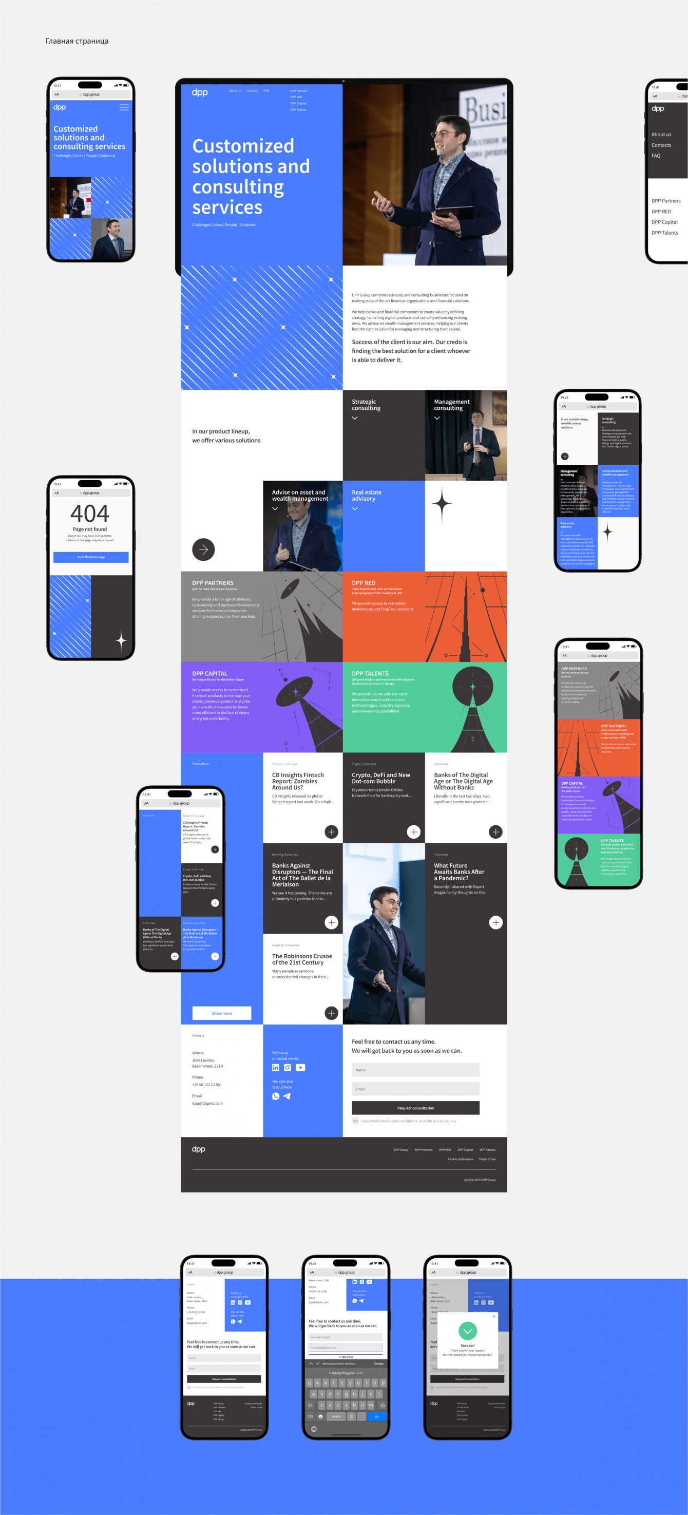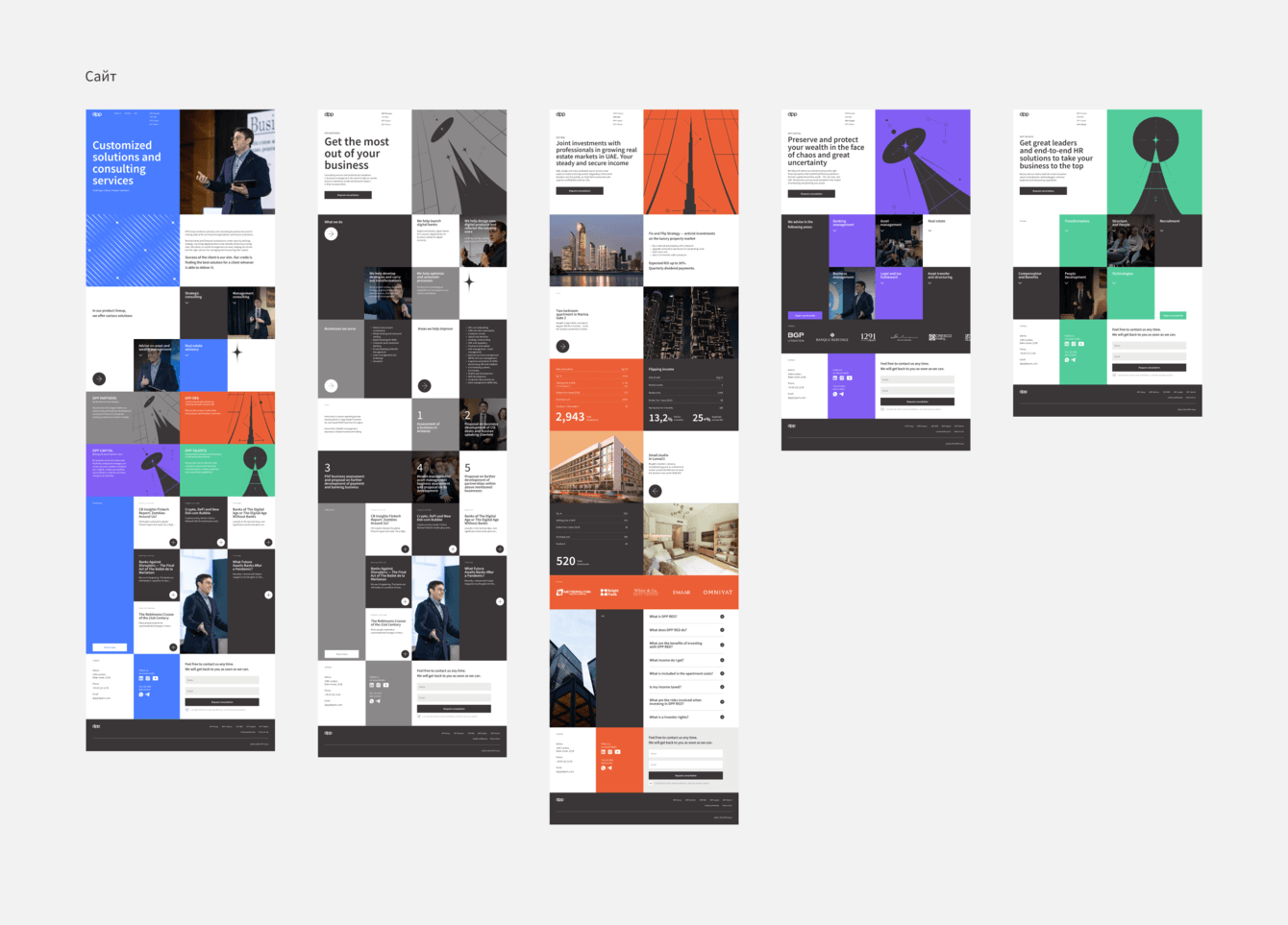 В сфере бизнес-консалтинга пользователи часто встречаются с утилитарными сайтами, поэтому мы с командой решили пойти в сторону выразительного дизайна, который выделил бы DPP Group на фоне конкурентов. Сайт имеет нестандартную и довольно яркую блочную структуру — этот приём помогает впечатлить и увлечь пользователя, а также удобен в последующей поддержке сайта: редактировании и добавлении нового контента.