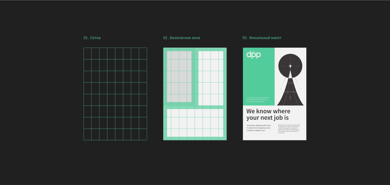 DPP позиционирует себя как надёжный и стабильный бизнес-партнёр. Мы решили усилить это ощущение за счёт простых, но устойчивых форм и гармонии пропорций. Модульная структура построения макетов передаёт собранность, комплектность и слаженность работы компании.
