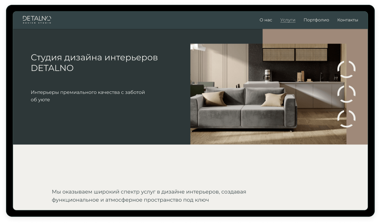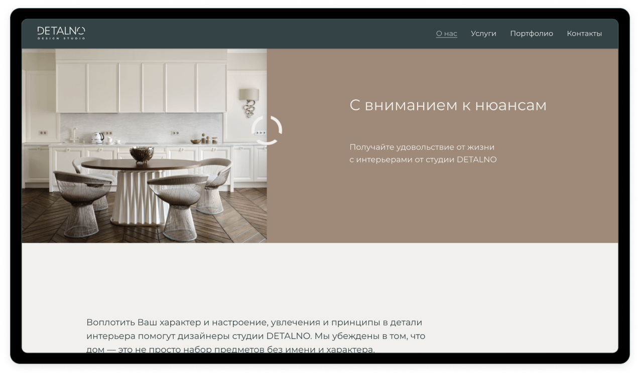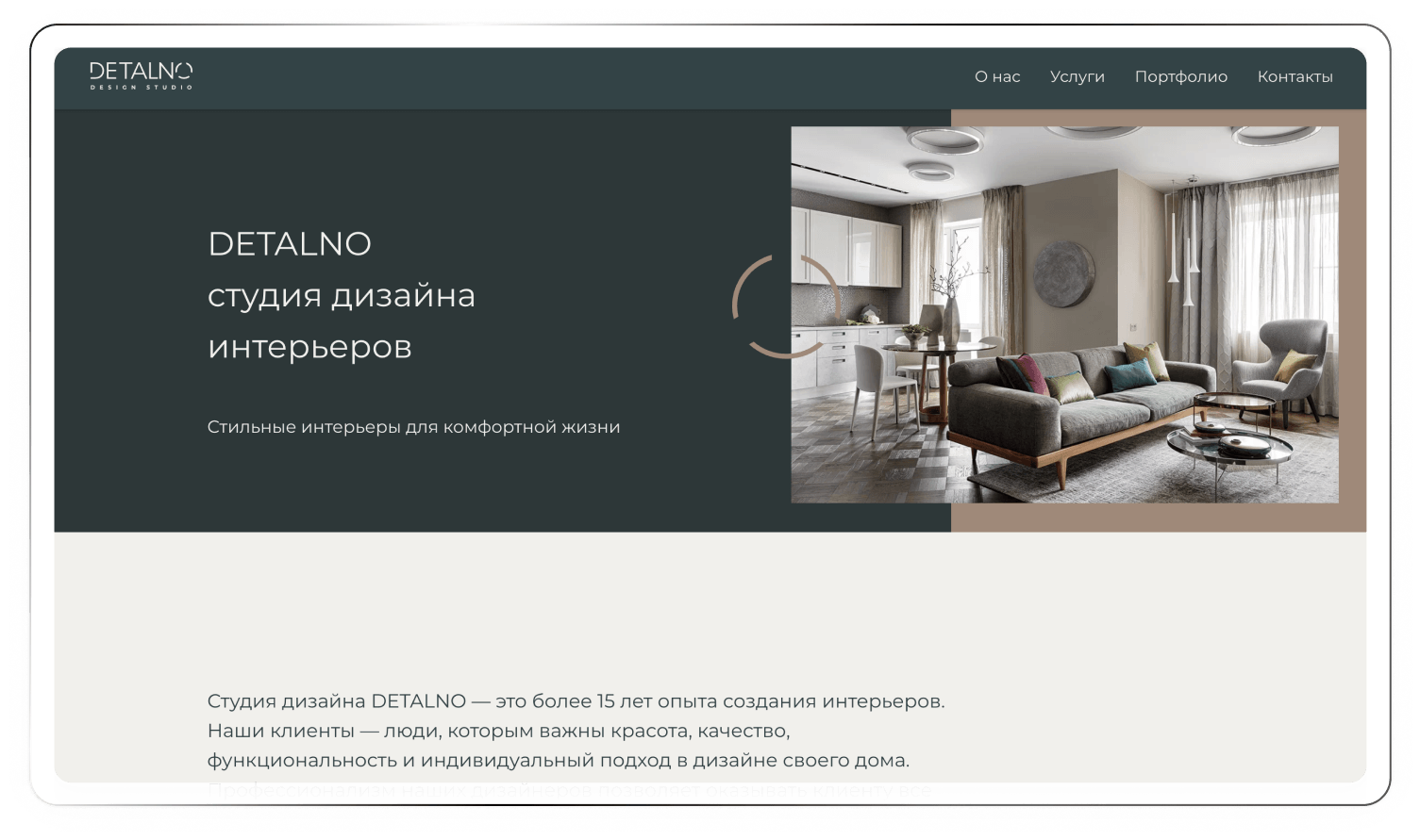 Создать фирменный стиль и сайт для DETALNO DESIGN STUDIO — компании, которая занимается интерьерным дизайном, разработкой дизайнерских и архитектурных проектов, строительными и отделочными работами, авторским и техническим надзором, комплектацией объектов «под ключ», а также декорированием и текстильным оформлением.