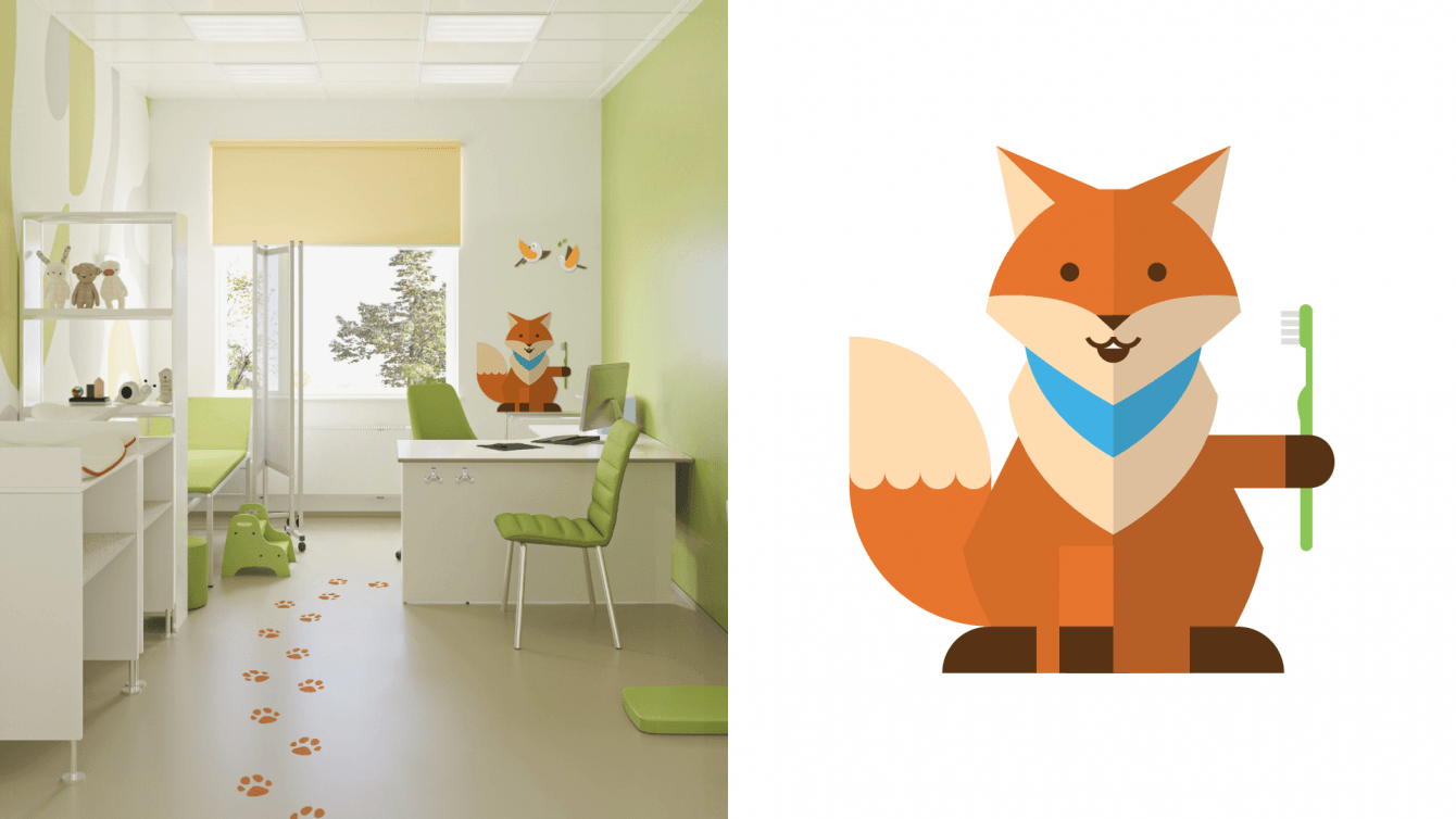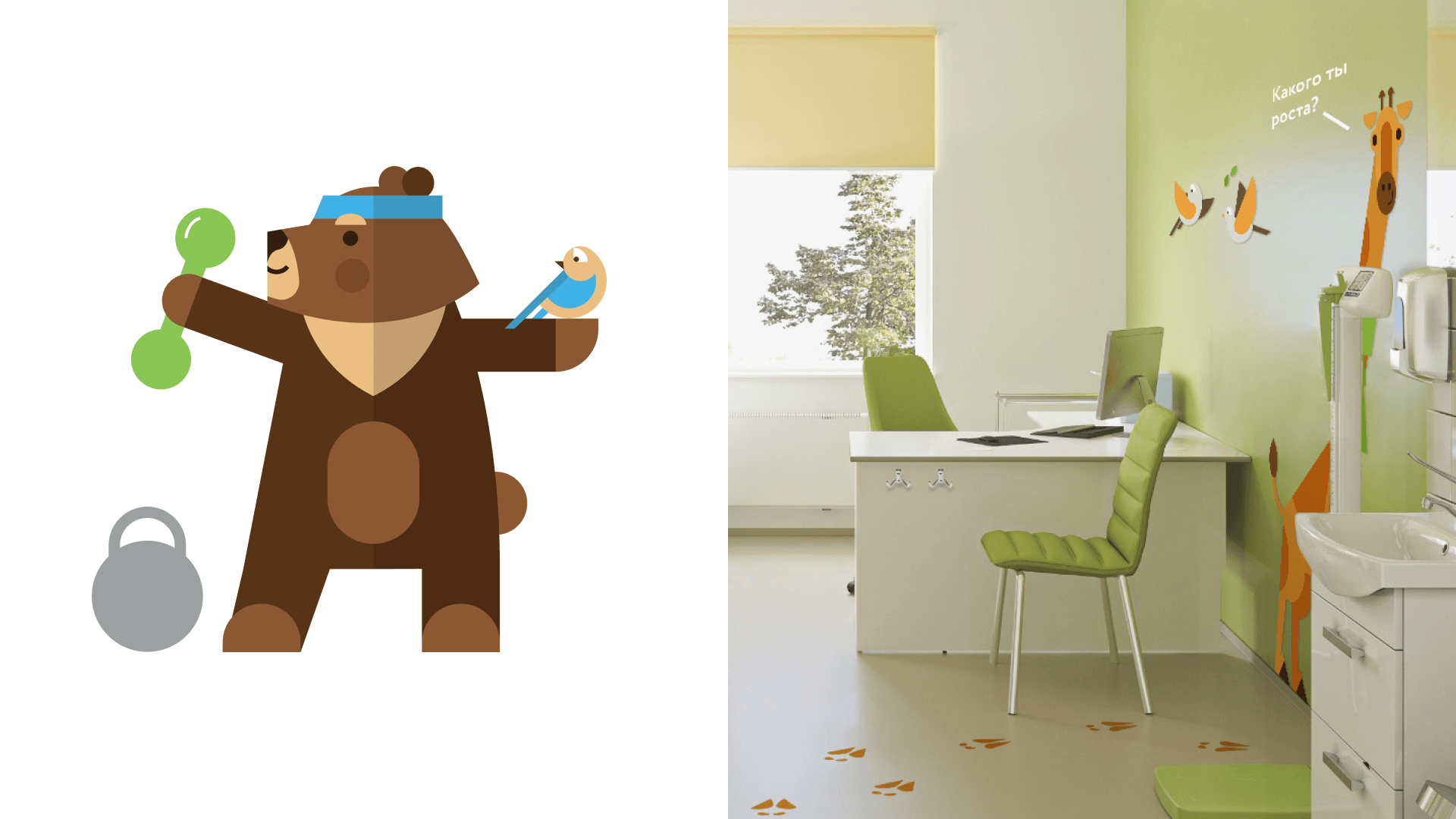 Специально для педиатрического отделения мы разработали дизайн маскотов — животных, которые развлекают маленьких посетителей Центра, помогают им преодолеть волнение перед посещением врача, а также учат здоровым привычкам.
