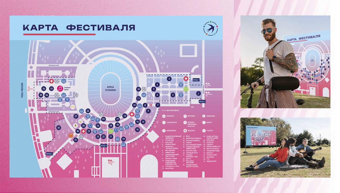 > разработали подробную карту фестиваля с расположением всех активностей — спортивных и музыкальных зон, фудкортов, объектов социальной инфраструктуры и т.д.