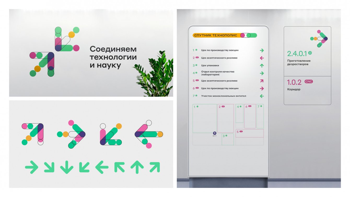 «Спутник Технополис» — один из крупнейших биологических комплексов России и Восточной Европы. В основе фирменного стиля лежит идея взаимодействия людей и технологий, когда точечные процессы складываются в одну общую безупречно работающую систему. Разработанная командой агентства навигация позволит легко ориентироваться на предприятии, быстро и недорого произвести и разместить таблички на заводе. Созданный стиль активно применяется в трансляциях на телепанелях в местах общего пользования. Актуальная информация с показателями производства отображается на экранах в реальном времени.