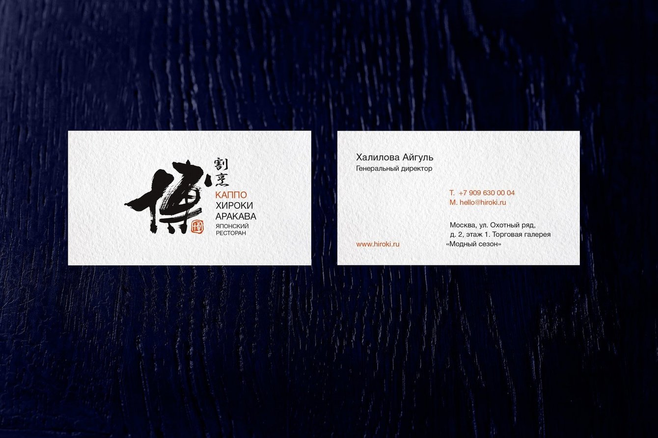 Клиент: ресторан Хироки Аракава. Ресторан основан японским шеф поваром Хироки. Требования к фирменному стилю были следующие: он не должен развлекать и отвлекать гостя. Точно следовать традициям оформления, которые сложились в Японии. Гости ресторана преимущественно японцы, живущие и работающие в Москве, а также те кто жил и работал в Японии.
