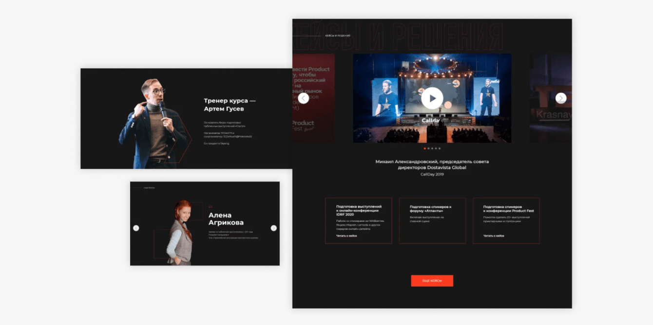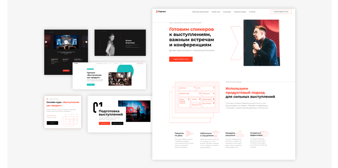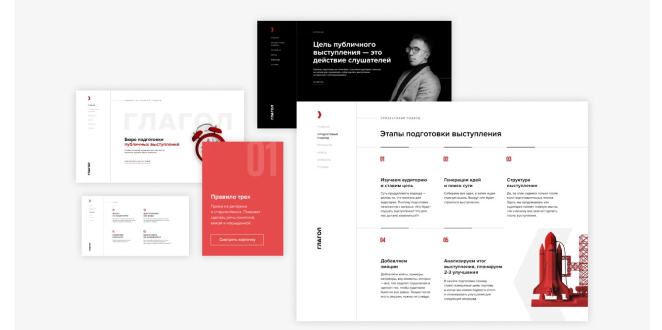 В сайте «Глагола» объединили подход бюро и те смыслы, которые ищут потенциальные клиенты: ощущение, что здесь тебя сделают крутым спикером, ты будешь выступать на больших площадках, тебя будут слушать. Сделали сайт так, чтобы он рассказывал о людях на языке «Глагола».