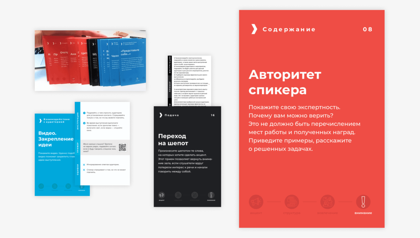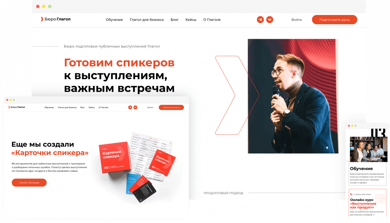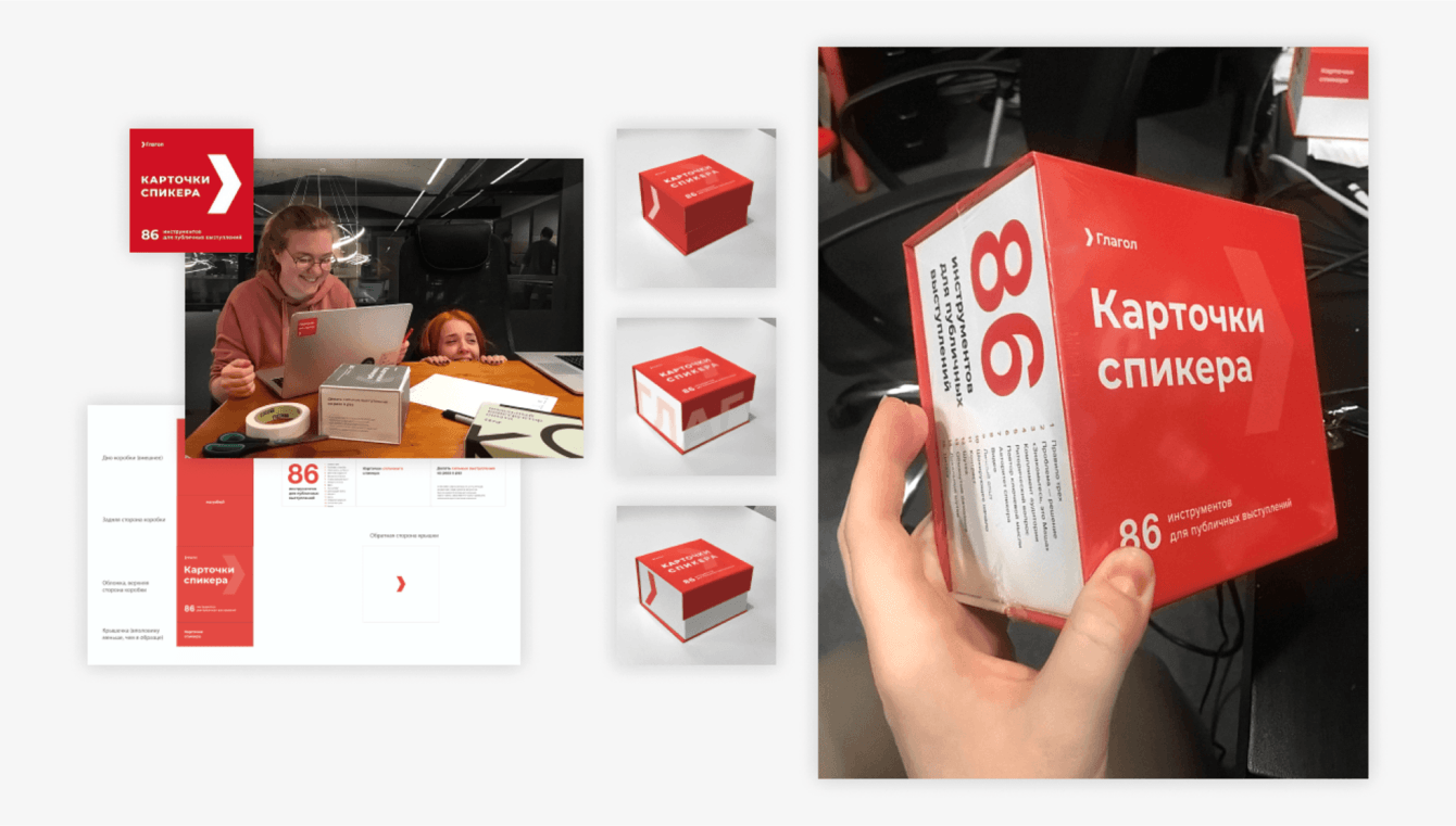 «Глагол» — это бюро публичных выступлений, которое готовит людей к презентациям, лекциям и конференциям, обучает целые корпоративные отделы. Фишка ребят — делать каждое выступление в продуктовом подходе с заботой об аудитории. Мы разработали для бюро новый фирстиль, сайт и уникальный маркетинговый продукт «Карточки спикера».