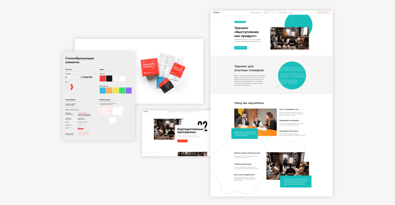 Красный остаётся основным цветом «Глагола», а дополнительные помогают навигации по продуктам. Получается система. Пользователь сразу понимает: бирюзовое — про очный тренинг. Так фирменный стиль становится гибким, развивается и адаптируется к потребностям растущей компании.
