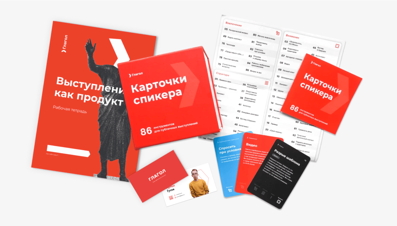 Бюро проводит очные тренинги, на которых использует печатные материалы: рабочие тетради, канвасы, чеклисты. Всё это помогает ученикам систематизировать знания и даёт готовые инструменты. Основатель «Глагола» Артём Гусев придумал новый инструмент — набор из 86 карточек с быстрыми приёмами для публичных выступлений.