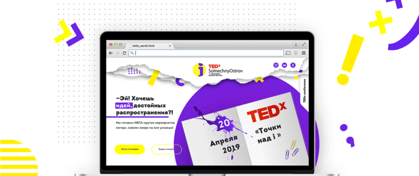 Новый фирменный стиль гармонично вписался в оформление сайта, POS-материалов и социальных сетей мероприятия: https://www.instagram.com/tedxsolnechnyostrov/, https://vk.com/tedxsolnechnyostrov, https://www.facebook.com/tedxsolnechnyostrov/