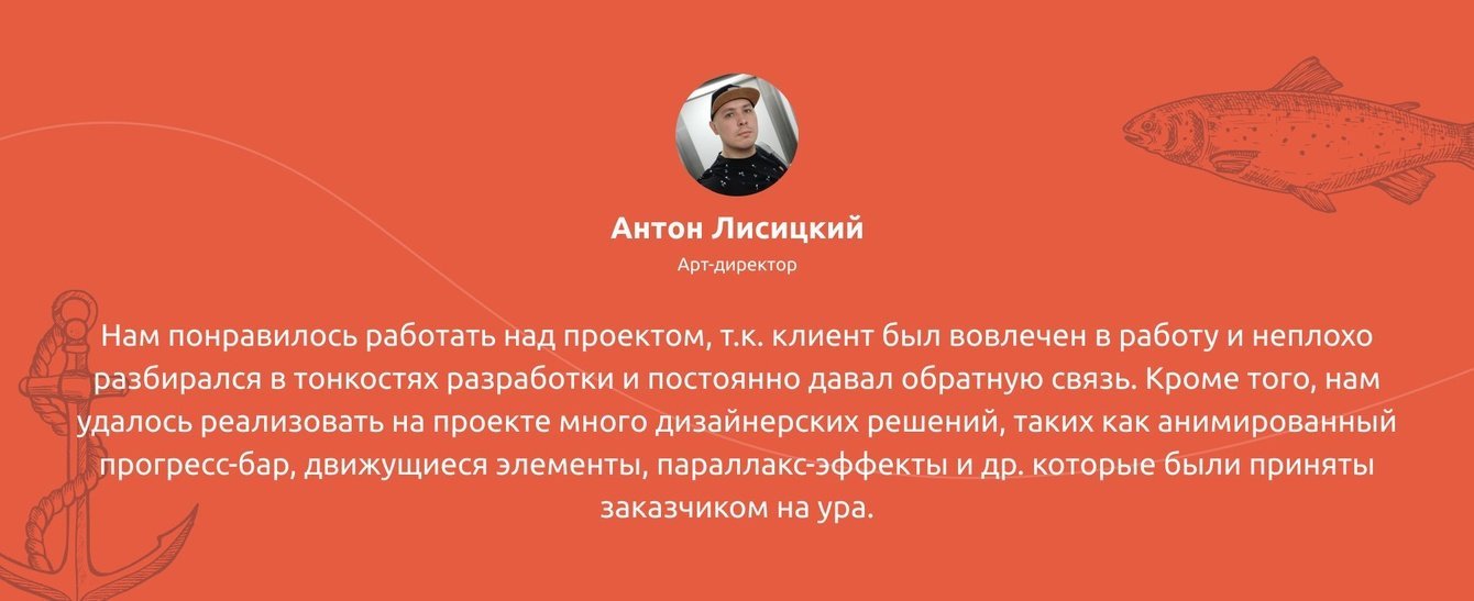 В результате удалось создать крутой адаптивный сайт, с необычным, для данной отрасли дизайном, который не только выделил компанию на фоне конкурентов, но и позволил увеличить продажи рыбной продукции.