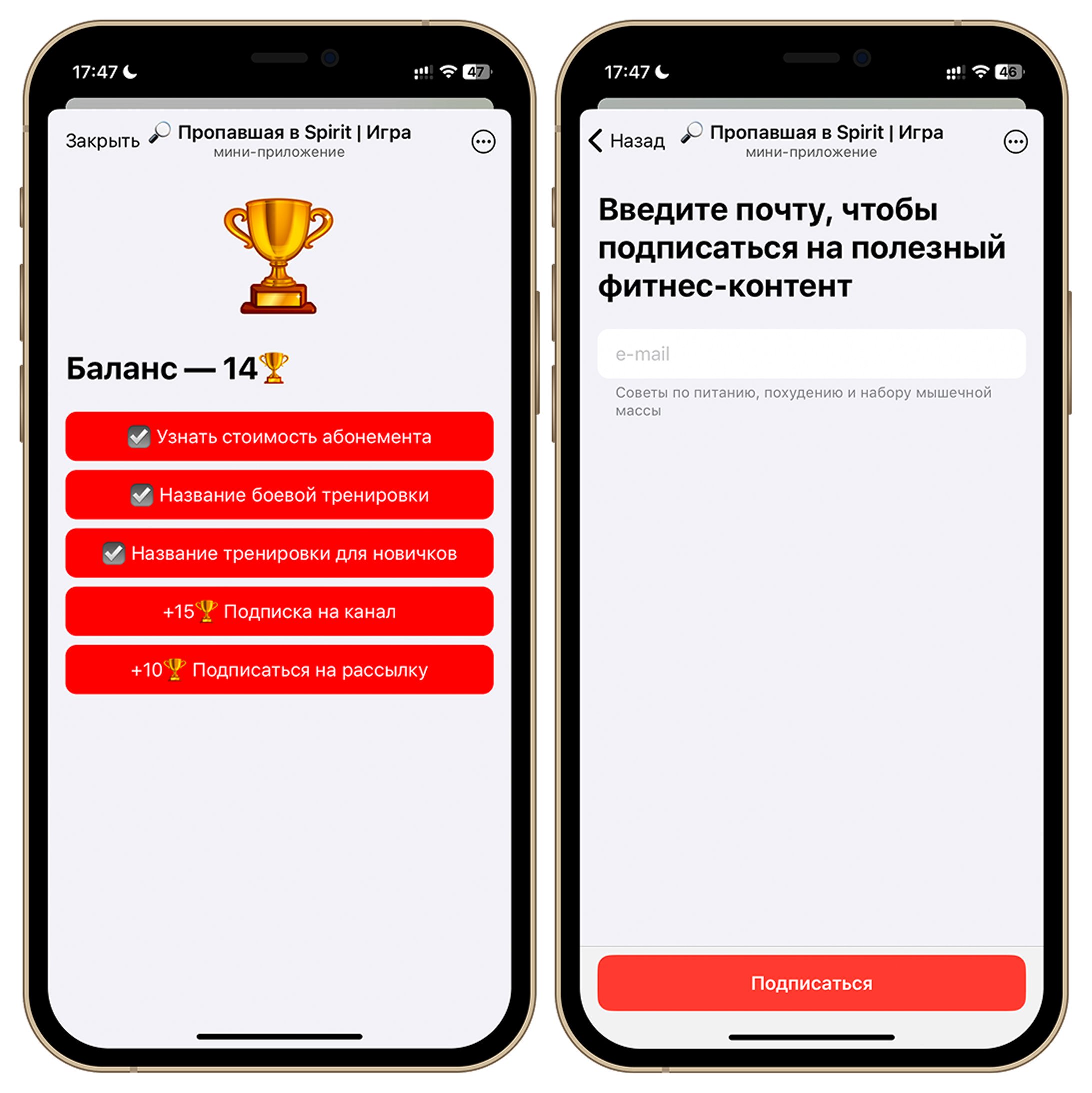 – подписаться на телеграм-канал фитнес-клуба → читатель подписывается на телеграм-канал клуба, без этого шага он не сможет играть дальше.
