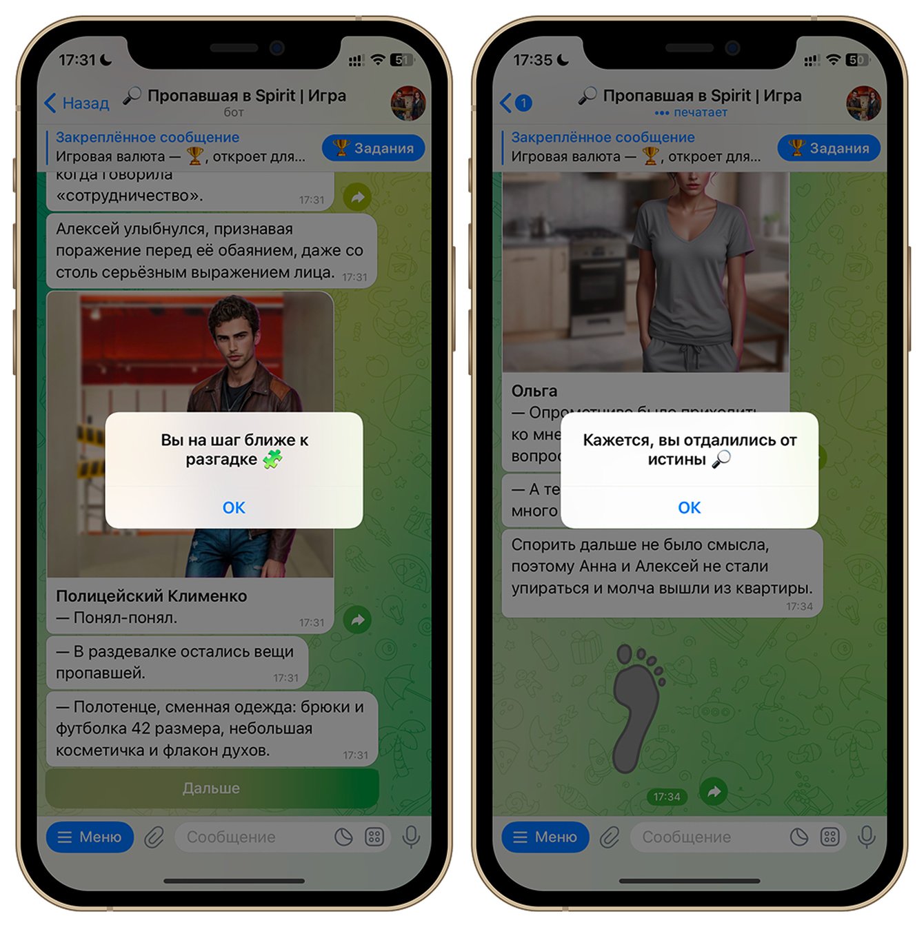 Попап «Вы на шаг ближе к разгадке ?» появляется, когда игрок приближается к разгадке, а «Кажется, вы отдалились от истины ?», когда отдаляется от неё.