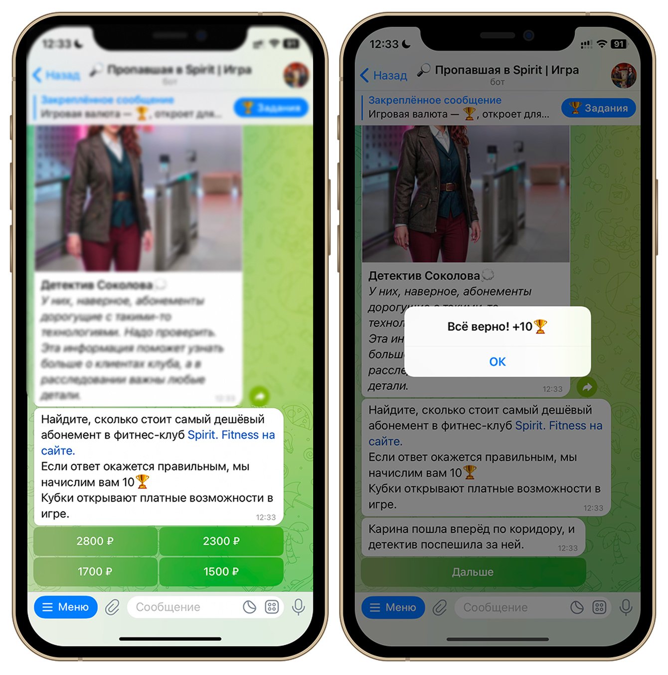 Нам предстояло запустить игру-бота, которая будет приводить заказчику подписчиков в Телеграм-канал и новых клиентов в фитнес-клуб. Чтобы решить эту задачу, игроков решили привлекать детективным сюжетом.