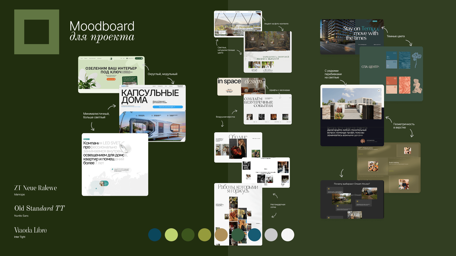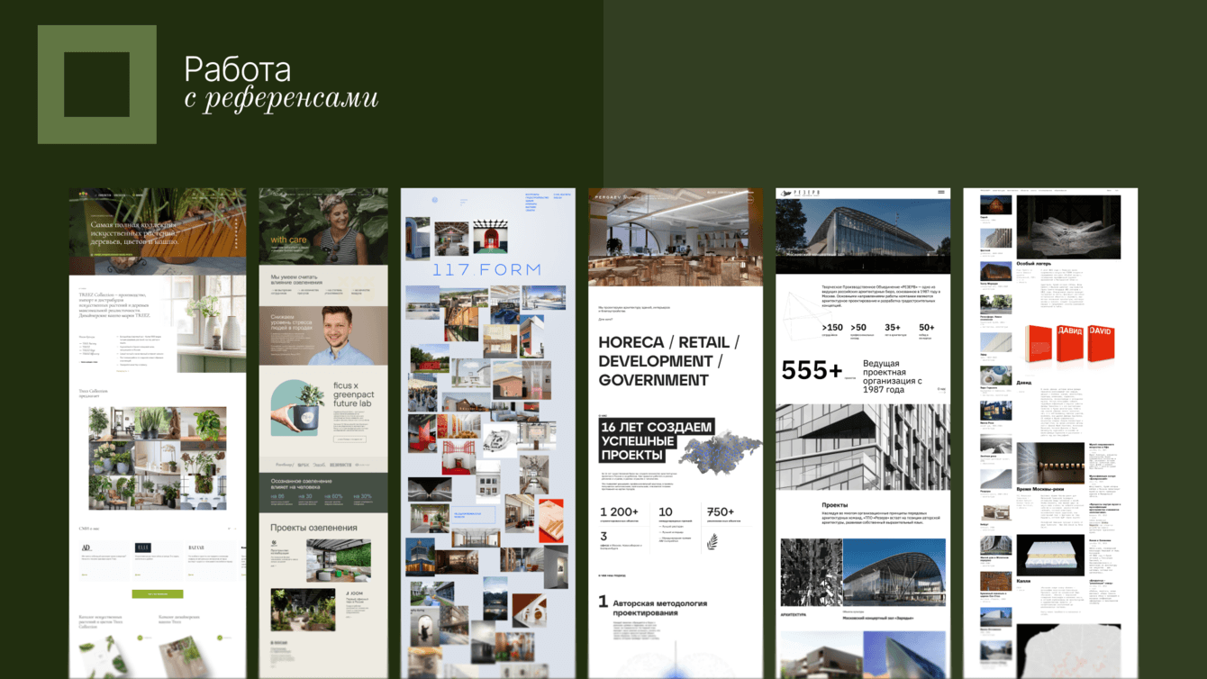 Клиенту нужен был сайт с четкой геометрией, архитектурной строгостью и журнальной эстетикой. Опираясь на этот запрос, мы разработали первую концепцию. В ее основе спокойные зеленые и земляные оттенки, лаконичные тексты с тематическими шрифтами и премиальные фотографии, которые гармонично дополняет гласс-эффект — прозрачное стекло, подчеркивающее чистоту и журнальную эстетику сайта.